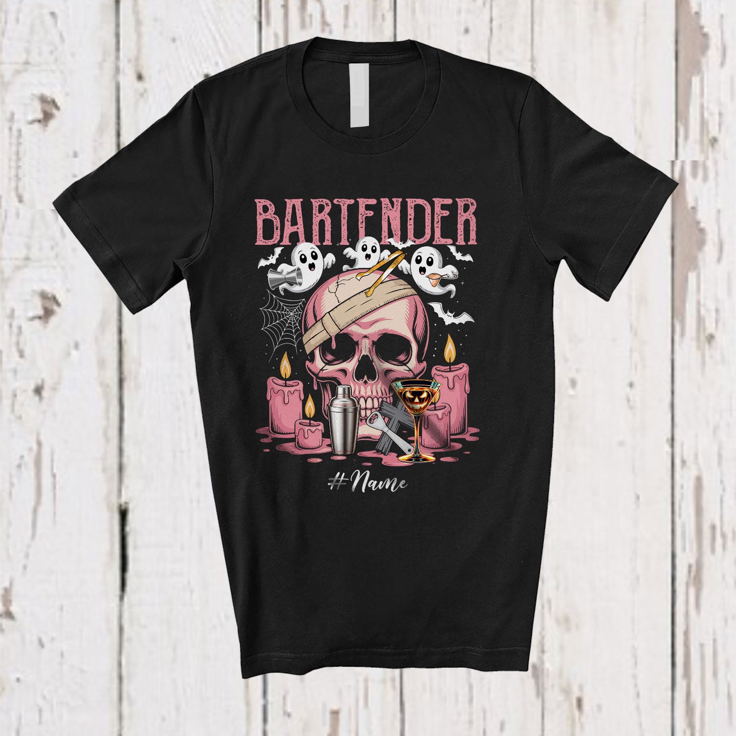 • Personalized Custom Name Bartender; Awesome Halloween Bartender Boo Ghost Skull; Proud Jobs T-Shirt. This cotton t-shirt is a durable staple product with a classic fit. One of the most popular items, it has a relaxed style made for everyday and casual wear.