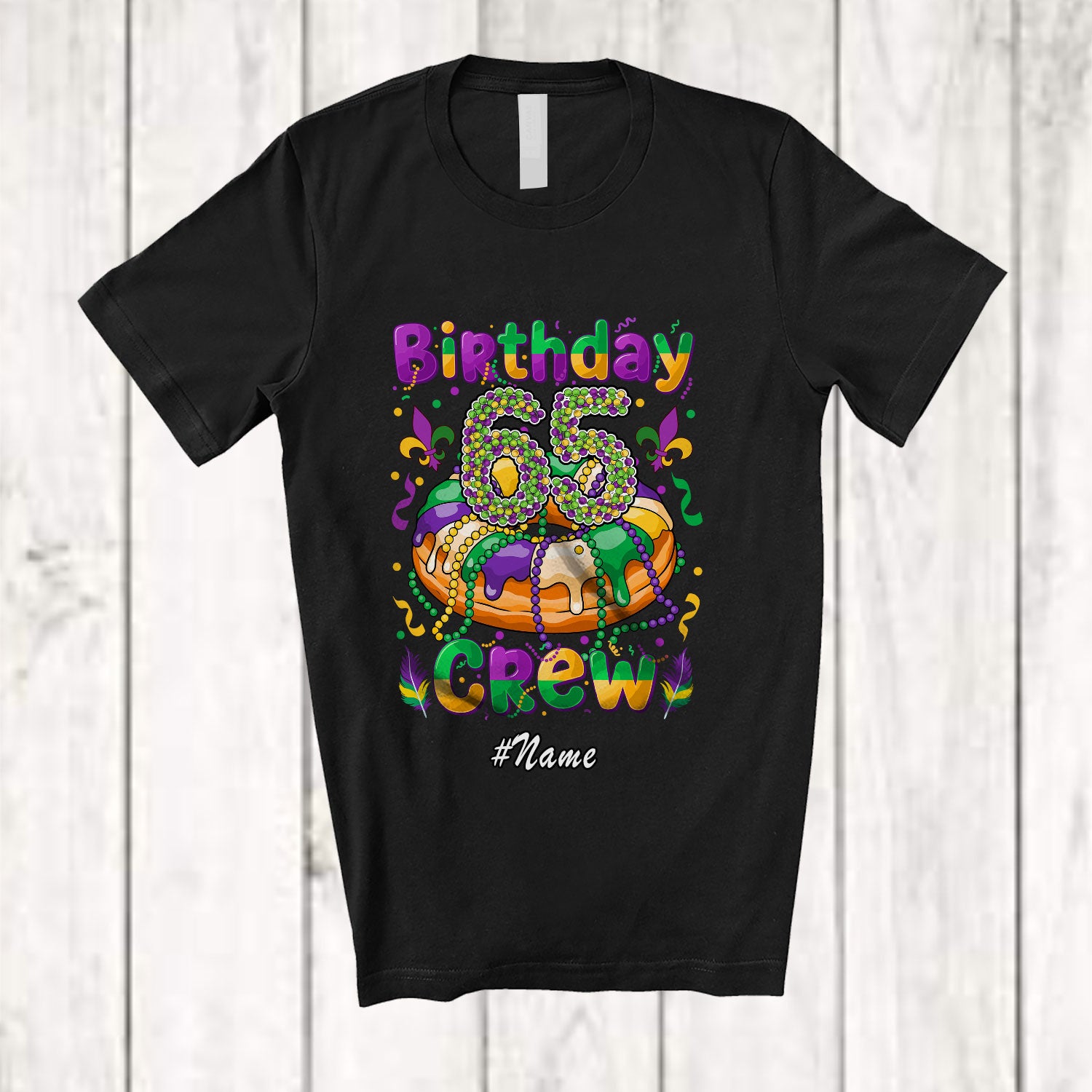 • Personalized Custom Name Birthday 65th Crew; Joyful Birthday Mardi Gras Breads King Cake T-Shirt. This cotton t-shirt is a durable staple product with a classic fit. One of the most popular items, it has a relaxed style made for everyday and casual wear.