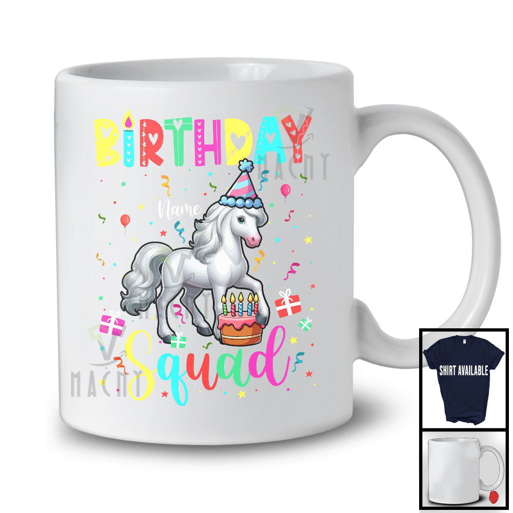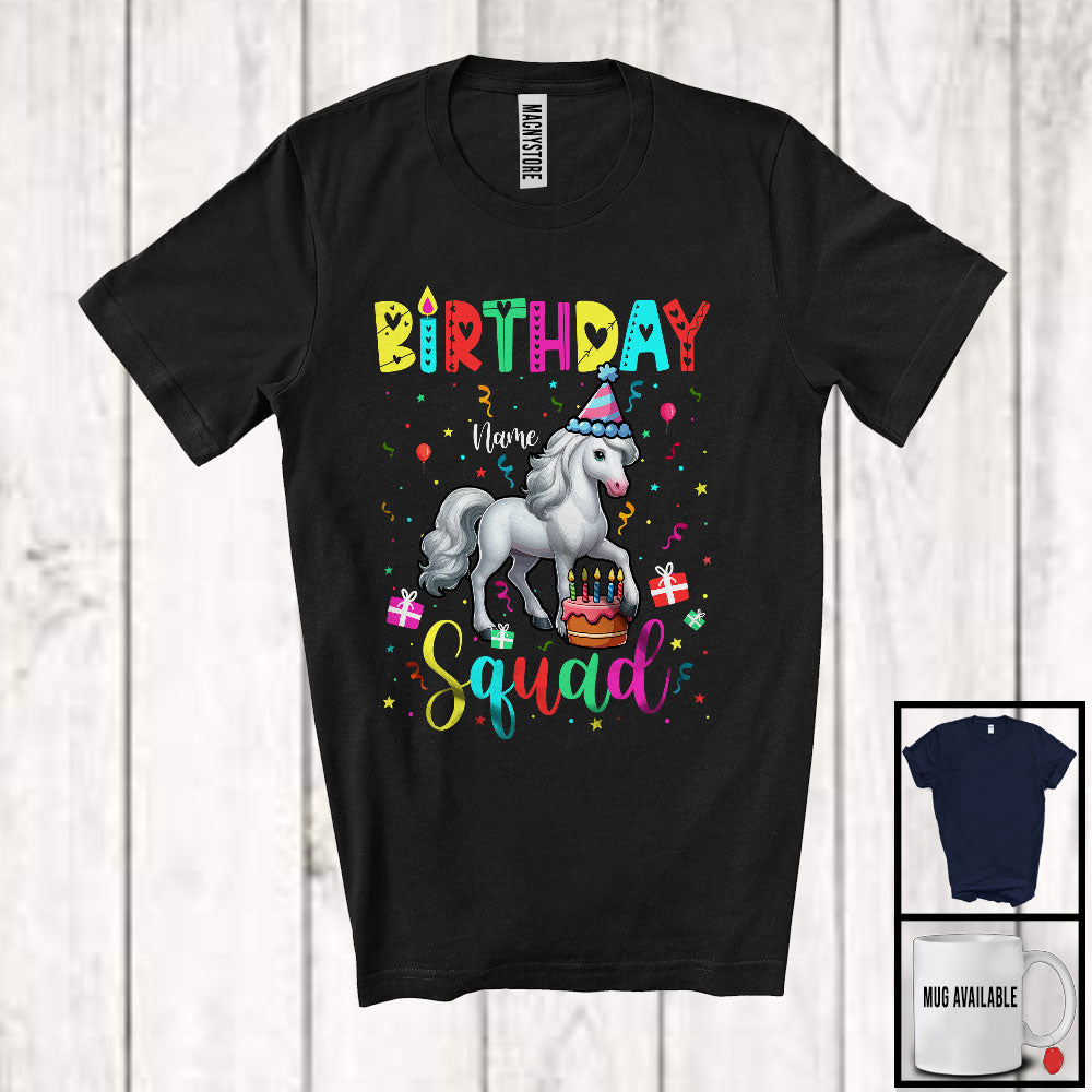 • Personalized Custom Name Birthday Squad; Joyful Birthday Cake Horse; Family Group T-Shirt. This cotton t-shirt is a durable staple product with a classic fit. One of the most popular items, it has a relaxed style made for everyday and casual wear.