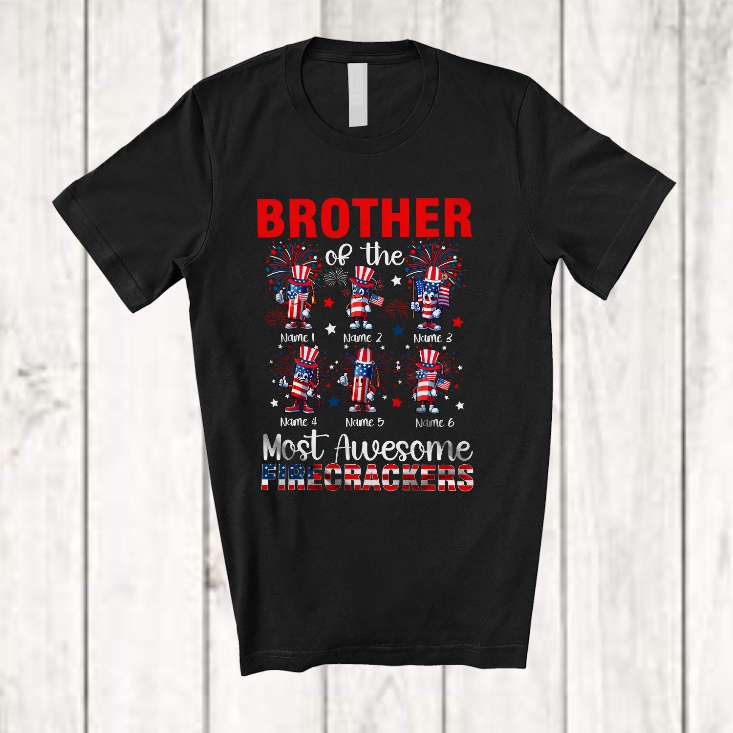 • Personalized Custom Name Brother Of The Most Awesome Firecrackers; Lovely 4th Of July Fireworks T-Shirt. This cotton t-shirt is a durable staple product with a classic fit. One of the most popular items, it has a relaxed style made for everyday and casual wear.
