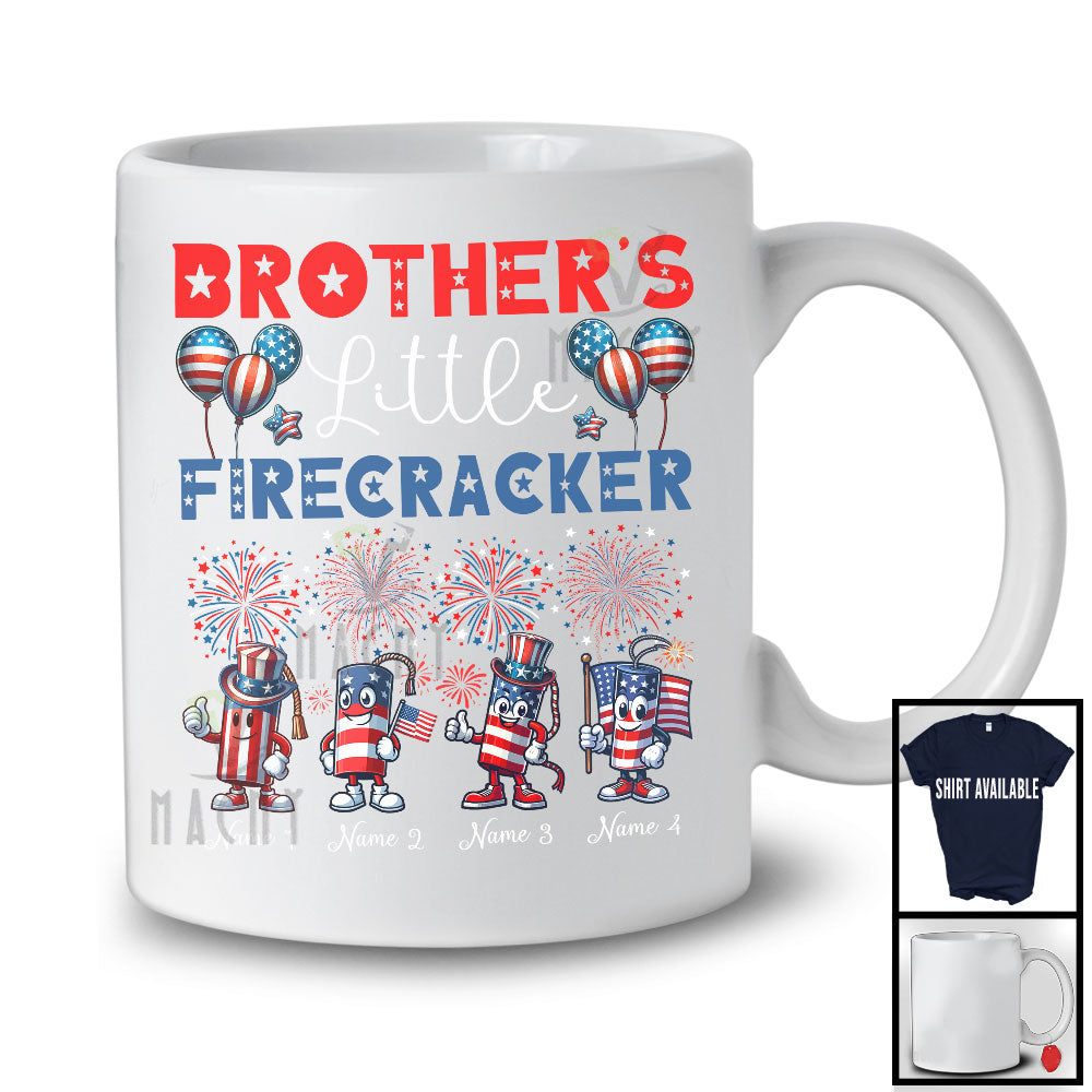 • Personalized Custom Name Brother's Little Firecracker, Proud 4th Of July Fireworks, Patriotic T-Shirt. This cotton t-shirt is a durable staple product with a classic fit. One of the most popular items, it has a relaxed style made for everyday and casual wear.