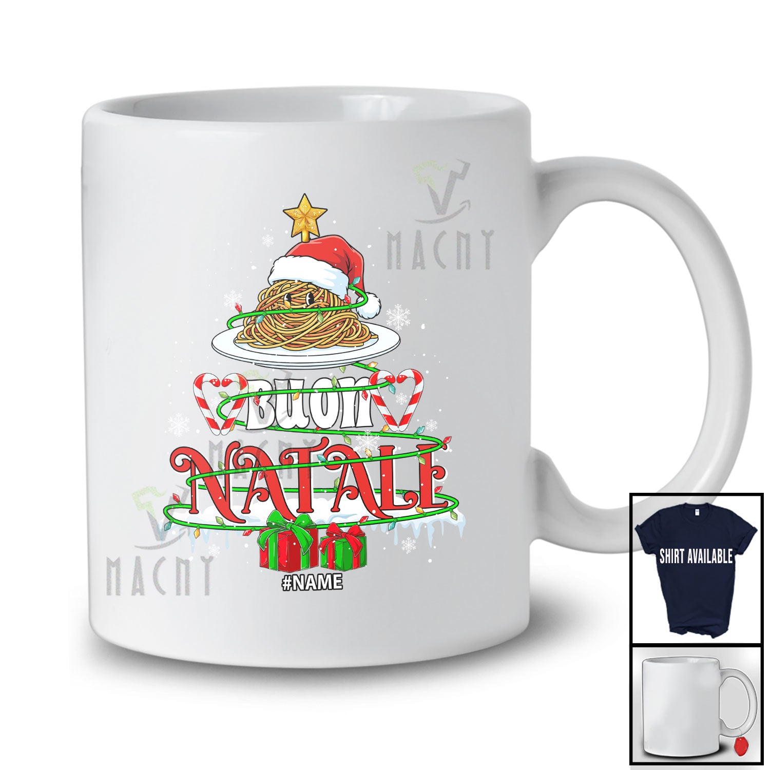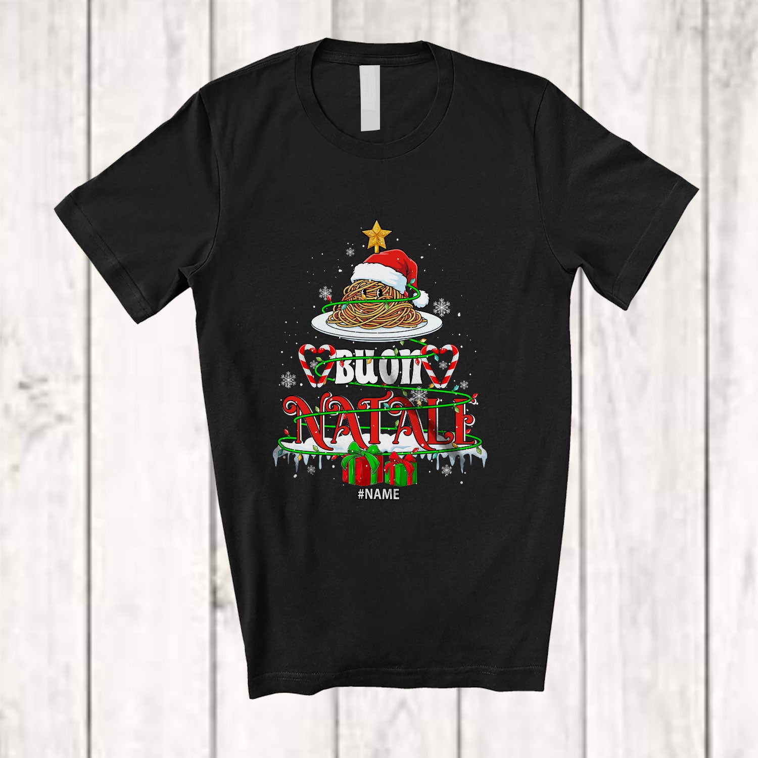 • Personalized Custom Name Buon Natale; Amazing Christmas Tree Santa Spaghetti Italian Food T-Shirt. This cotton t-shirt is a durable staple product with a classic fit. One of the most popular items, it has a relaxed style made for everyday and casual wear.
