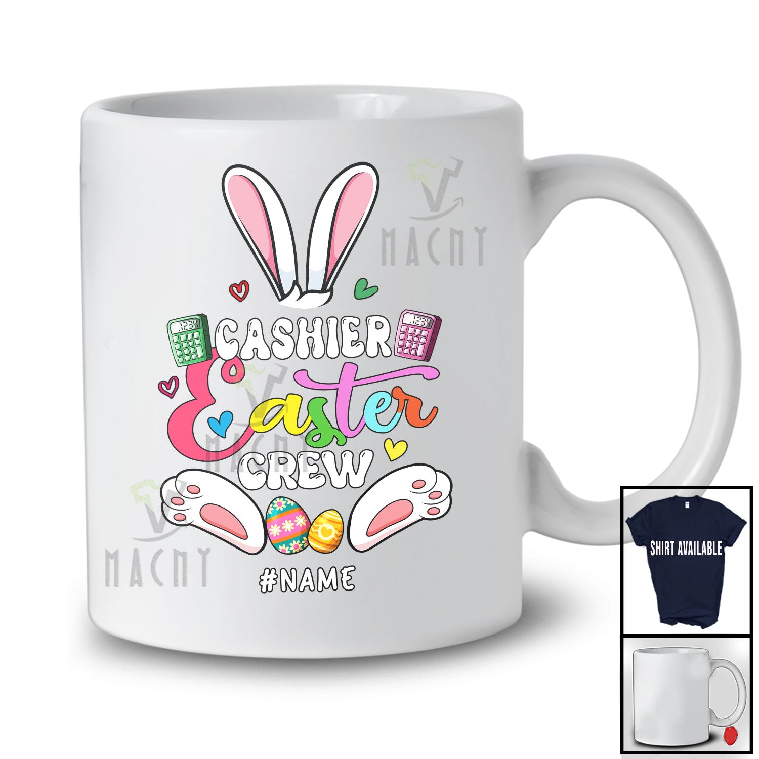Personalized Custom Name Cashier Easter Crew; Adorable Easter Bunny Ears; Family T-Shirt. This cotton t-shirt is a durable staple product with a classic fit. One of the most popular items, it has a relaxed style made for everyday and casual wear.