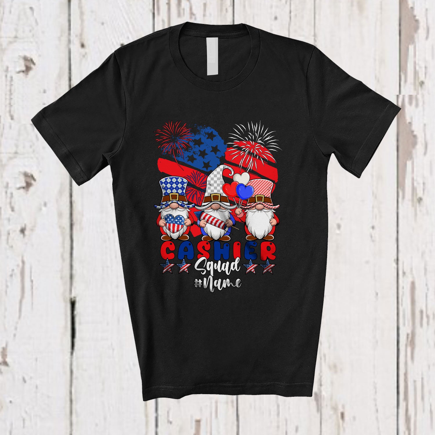 Personalized Custom Name Cashier Squad; Joyful 4th Of July Three Gnomes; US Flag Heart Patriotic T-Shirt