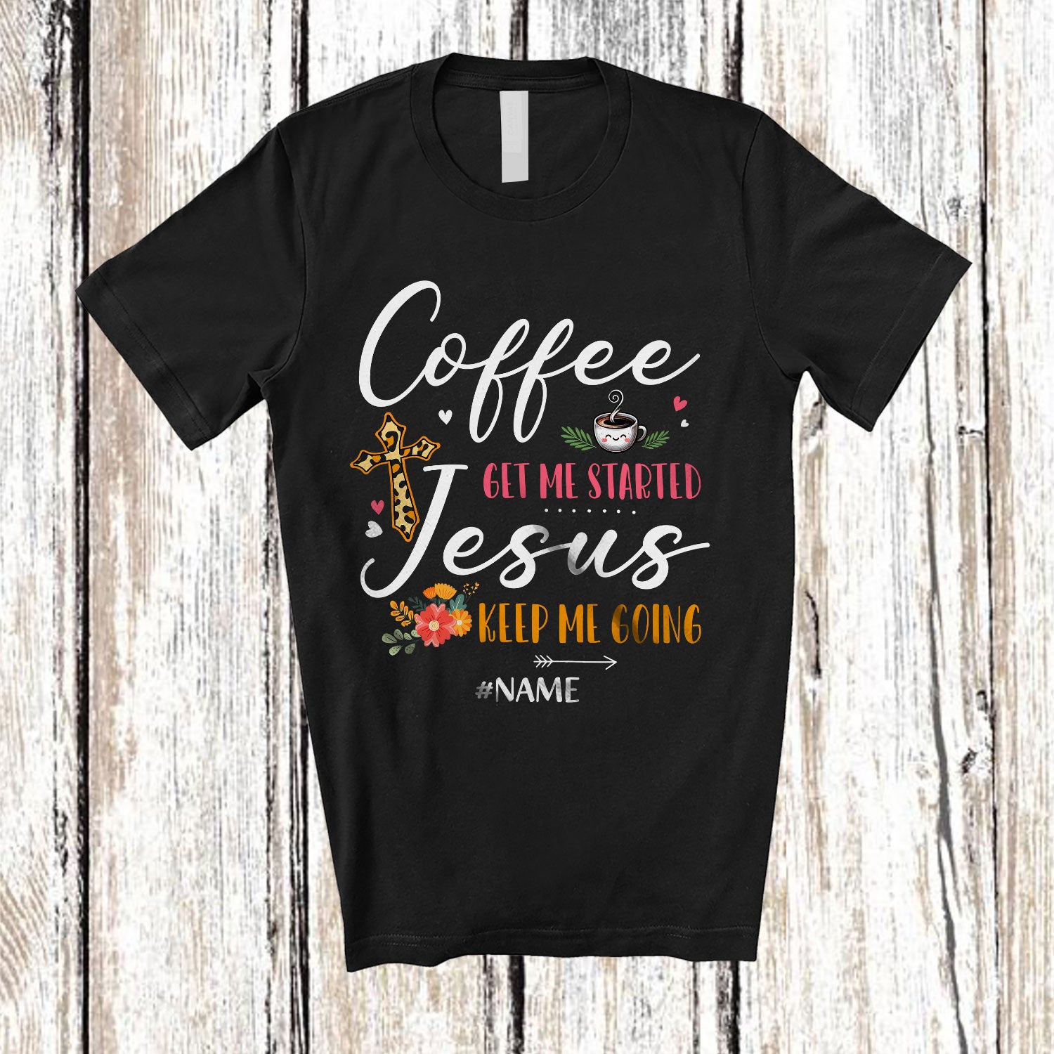 • Personalized Custom Name Coffee Gets Me Started Jesus Keeps Me Going; Joyful Leopard Cross T-Shirt. This cotton t-shirt is a durable staple product with a classic fit. One of the most popular items, it has a relaxed style made for everyday and casual wear.