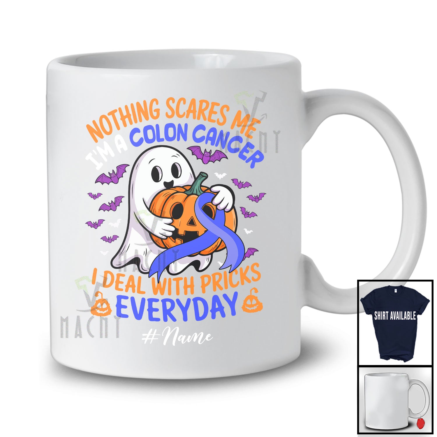 • Personalized Custom Name Colon Cancer Deal With Pricks; Scary Halloween Blue Ribbon Boo Ghost T-Shirt. This cotton t-shirt is a durable staple product with a classic fit. One of the most popular items, it has a relaxed style made for everyday and casual wear.