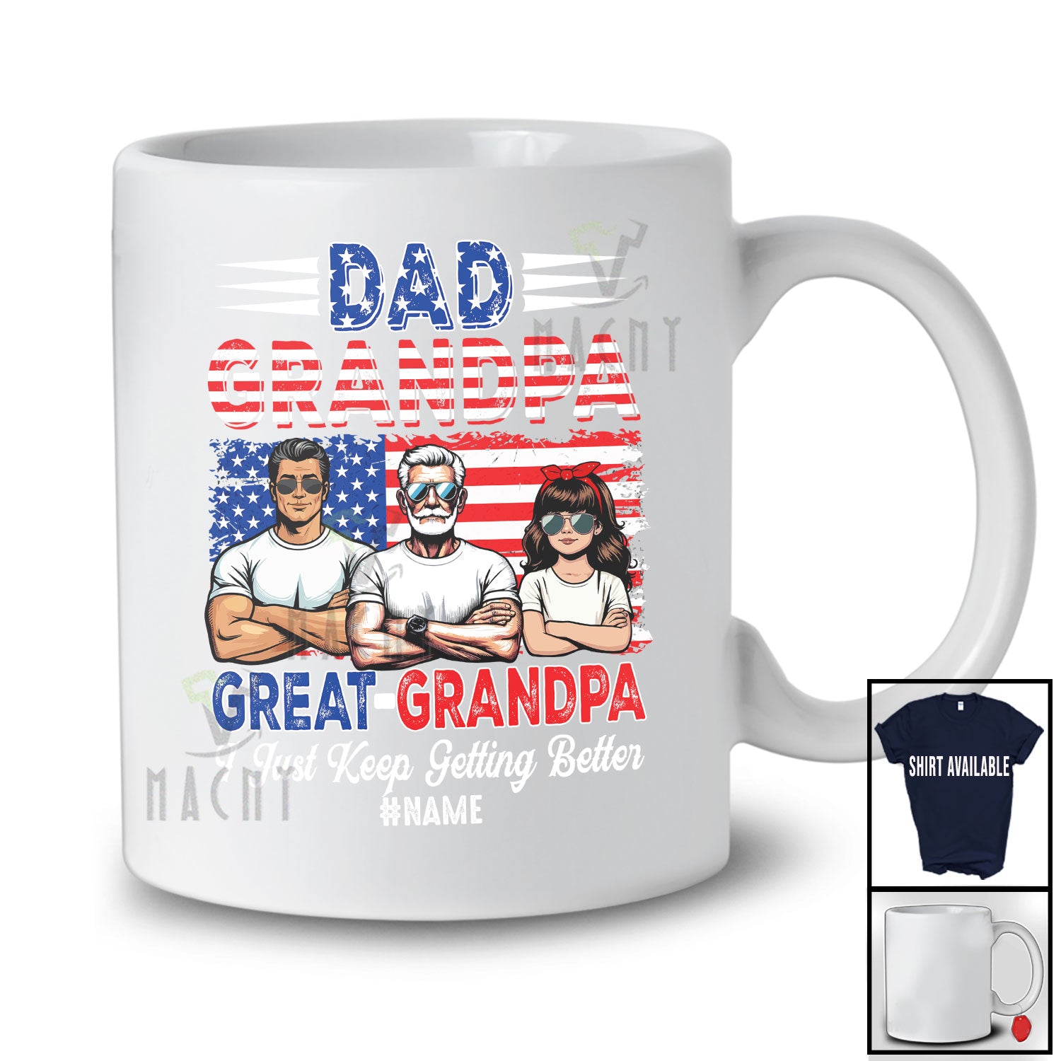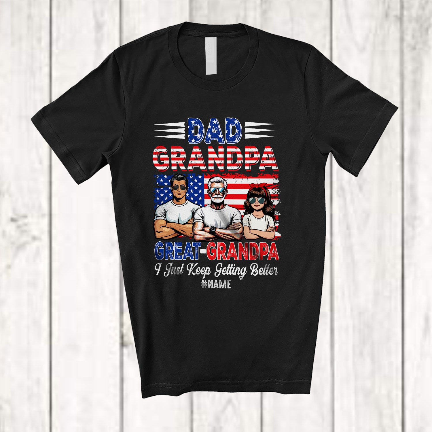 Personalized Custom Name Dad Grandpa Great Grandpa Getting Better; Proud Father's Day Daughter T-Shirt. This cotton t-shirt is a durable staple product with a classic fit. One of the most popular items, it has a relaxed style made for everyday and casual wear.