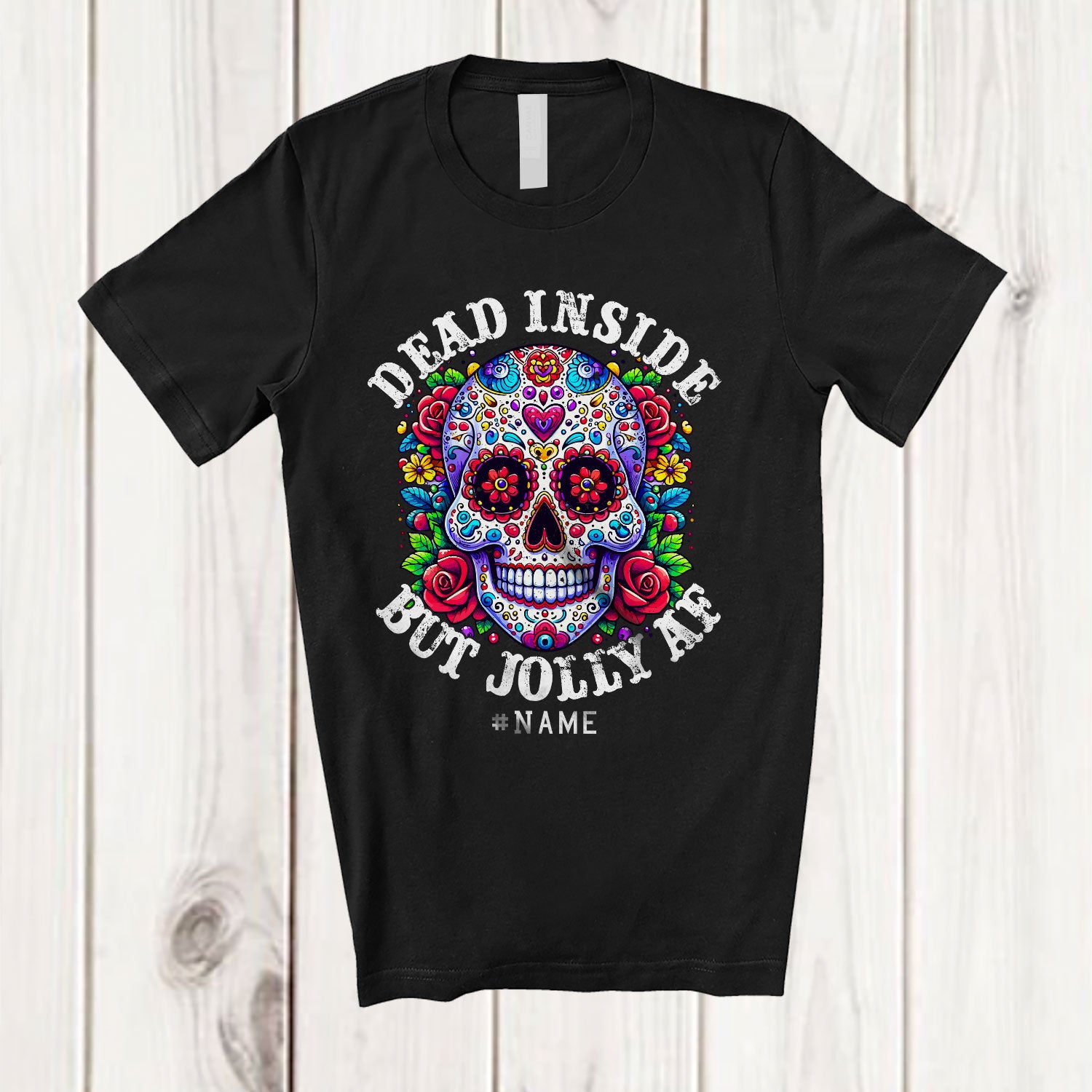 Personalized Custom Name Dead Inside But Jolly AF; Colorful Sugar Skull Flowers; Mexican Family T-Shirt
