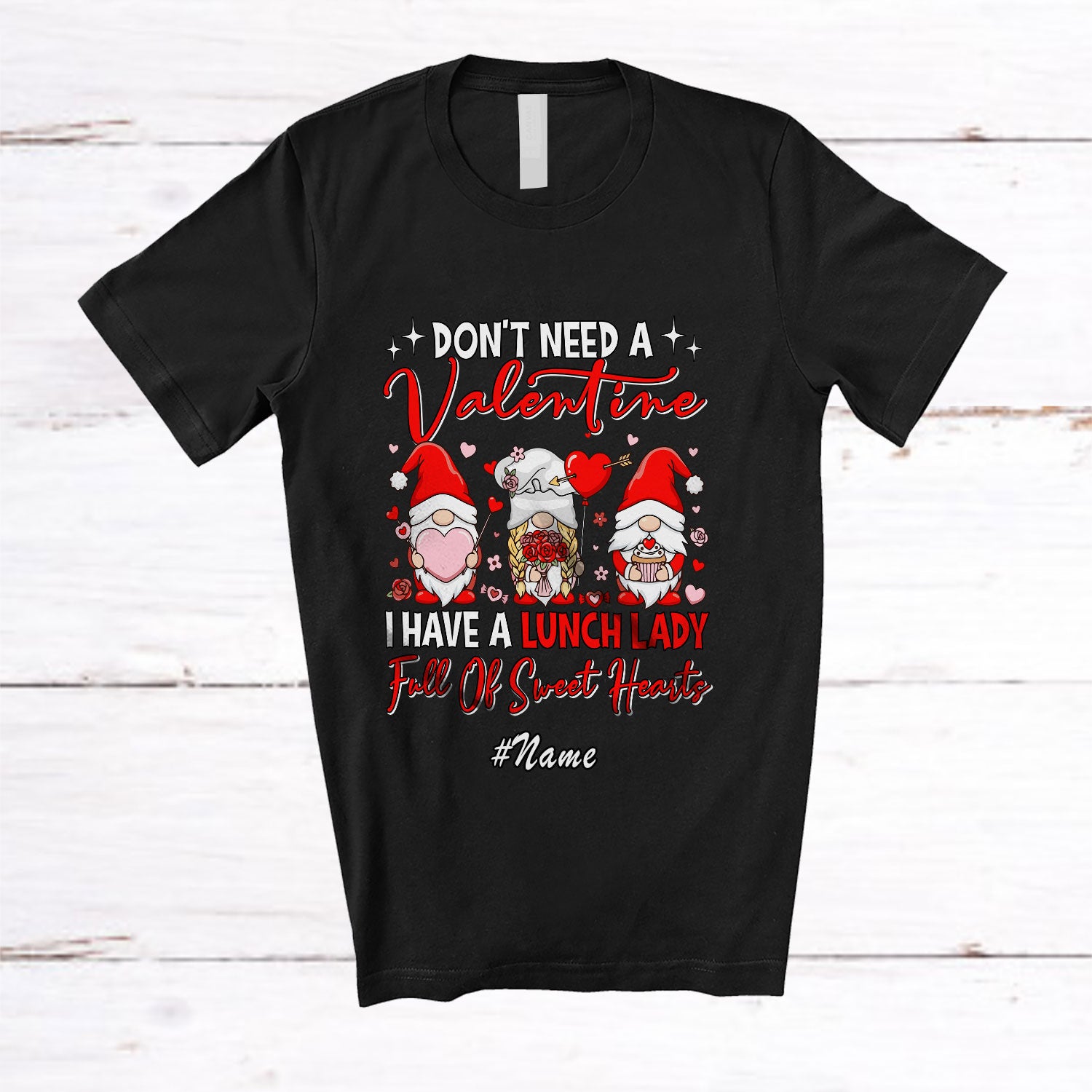 • Personalized Custom Name Don't Need Valentine I Have A Lunch Lady; Proud Jobs Three Gnomes T-Shirt. This cotton t-shirt is a durable staple product with a classic fit. One of the most popular items, it has a relaxed style made for everyday and casual wear.