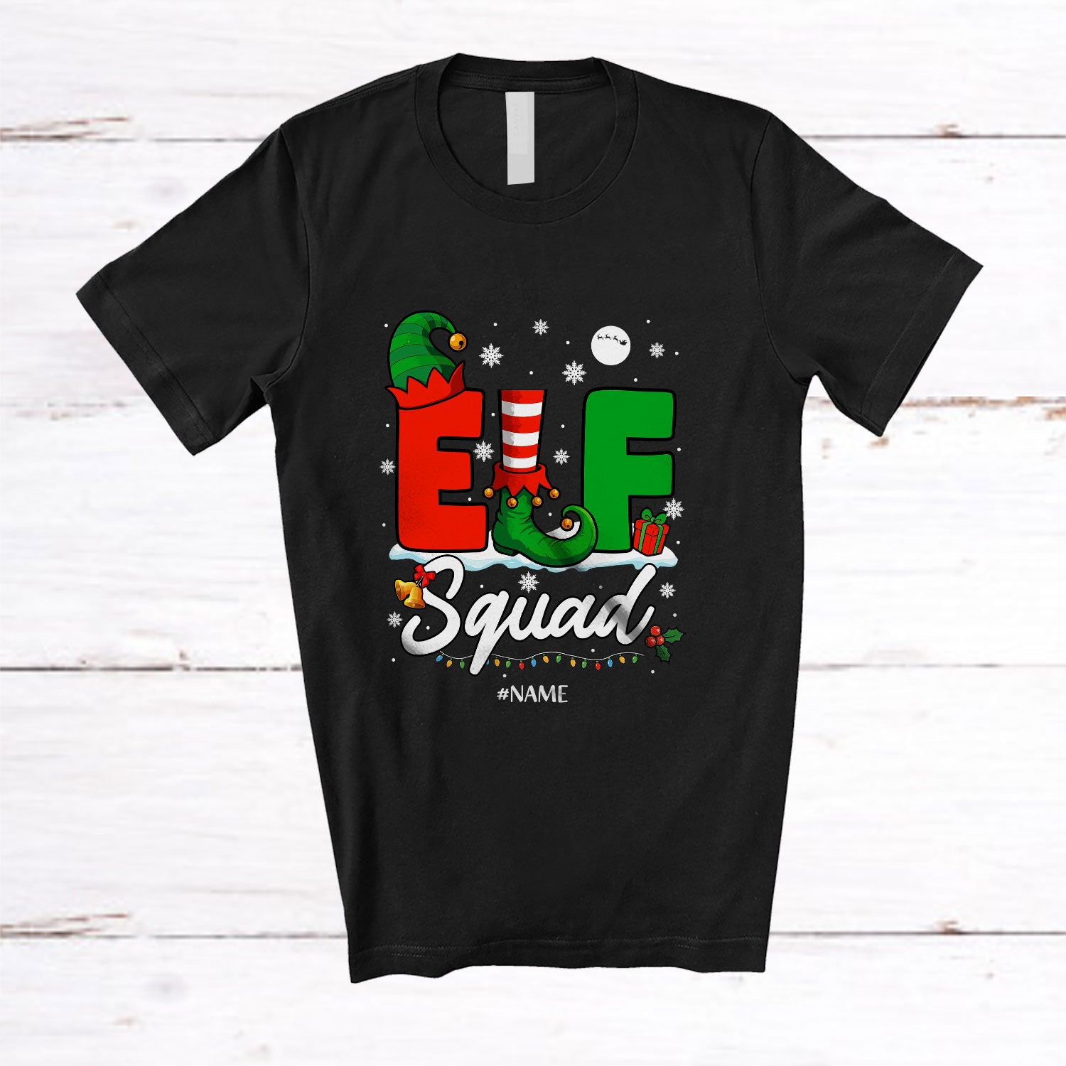 Personalized Custom Name Elf Squad; Humorous Christmas Elf Shoes Snowing; Pajama Family Group T-Shirt. This cotton t-shirt is a durable staple product with a classic fit. One of the most popular items, it has a relaxed style made for everyday and casual wear.
