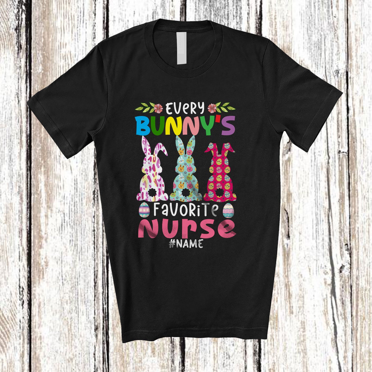 Personalized Custom Name Every Bunny's Favorite Nurse; Amusing Easter Eggs Three Bunnies T-Shirt. This cotton t-shirt is a durable staple product with a classic fit. One of the most popular items, it has a relaxed style made for everyday and casual wear.