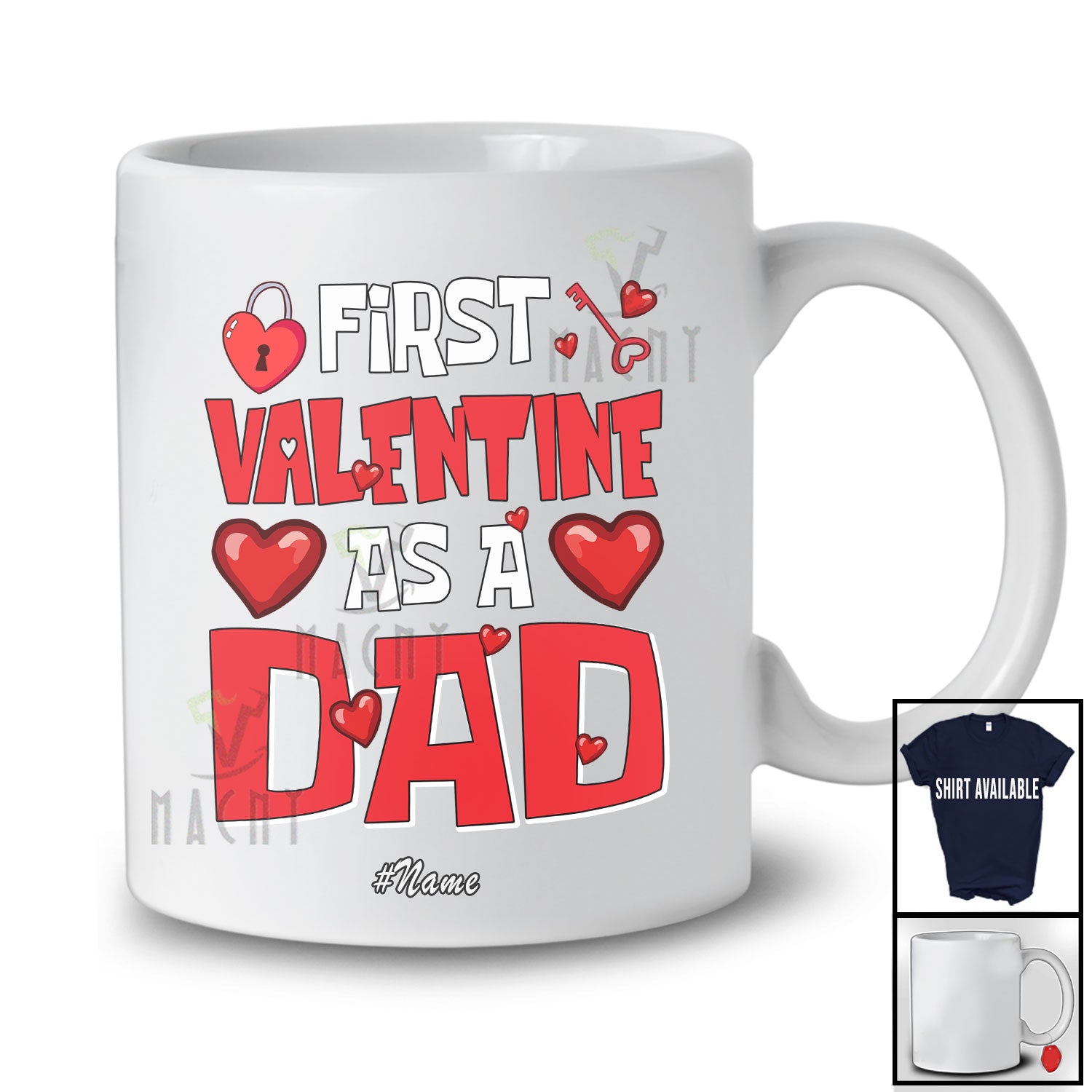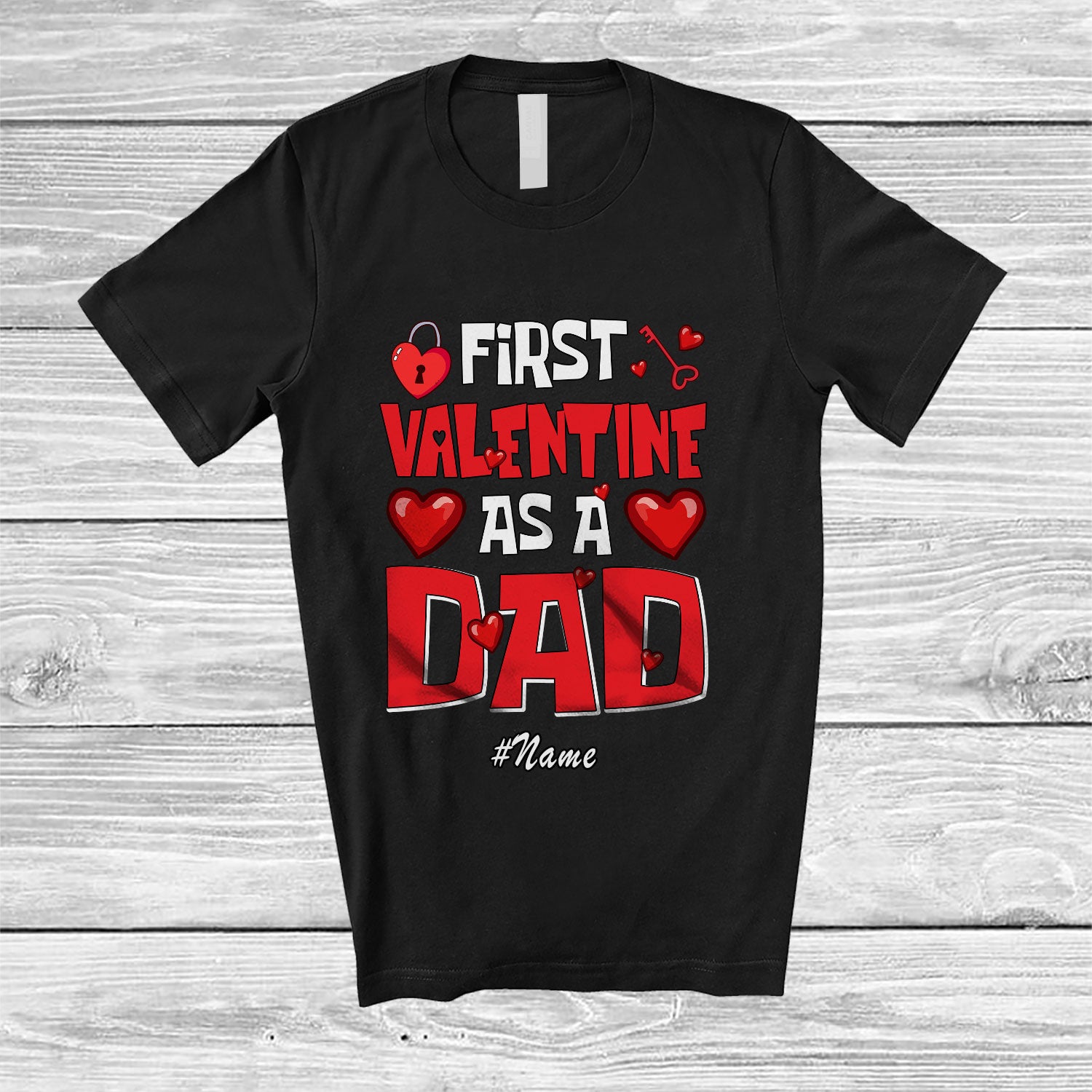 • Personalized Custom Name First Valentine As A Dad; Humorous Promoting Future Dad; Hearts Family T-Shirt. This cotton t-shirt is a durable staple product with a classic fit. One of the most popular items, it has a relaxed style made for everyday and casual wear.