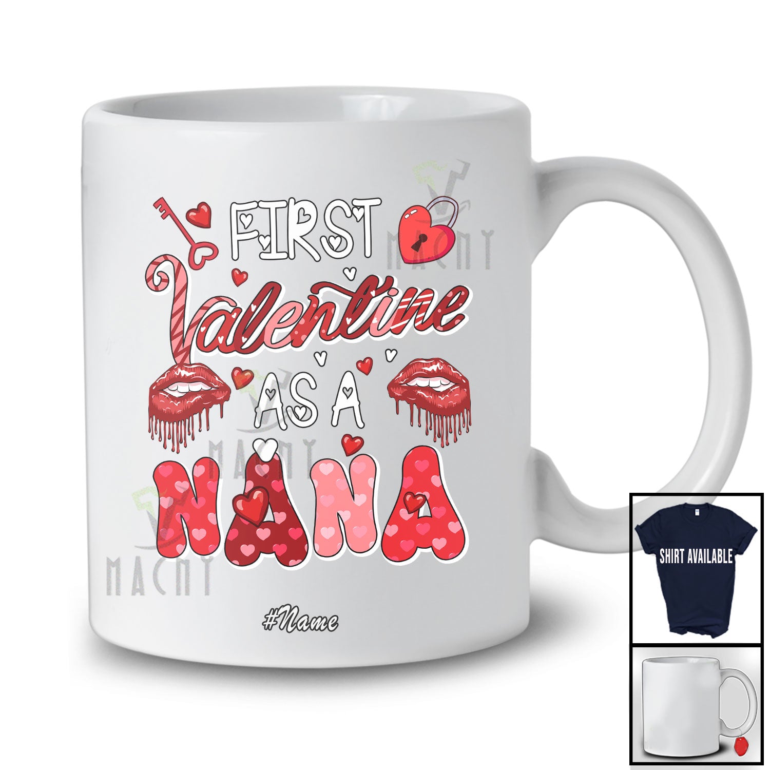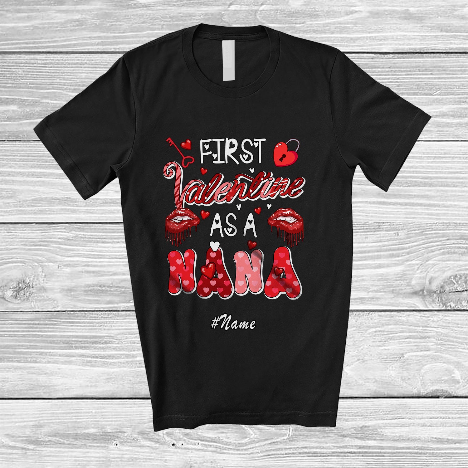 • Personalized Custom Name First Valentine As A Nana; Humorous Promoting Future Nana; Hearts Family T-Shirt. This cotton t-shirt is a durable staple product with a classic fit. One of the most popular items, it has a relaxed style made for everyday and casual wear.