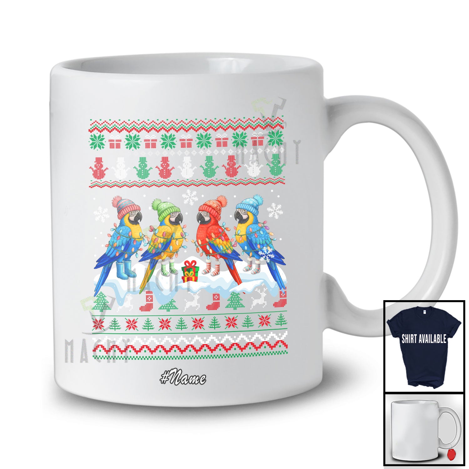 Personalized Custom Name Four X-mas Macaw; Adorable Christmas Lights Sweater Bird Animal T-Shirt. This cotton t-shirt is a durable staple product with a classic fit. One of the most popular items, it has a relaxed style made for everyday and casual wear.