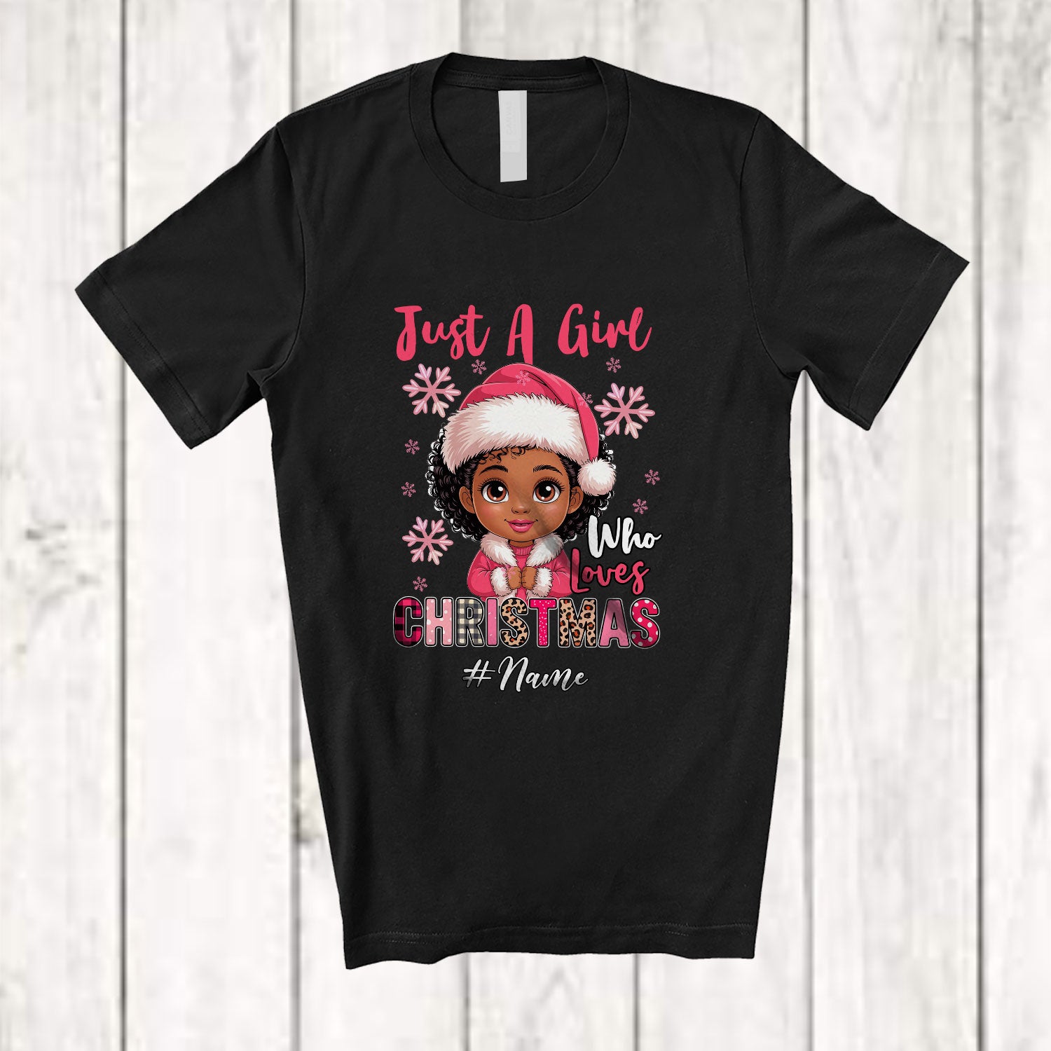 • Personalized Custom Name Girl Who Loves Christmas; Amusing Santa Afro Black Girl; Family T-Shirt. This cotton t-shirt is a durable staple product with a classic fit. One of the most popular items, it has a relaxed style made for everyday and casual wear.