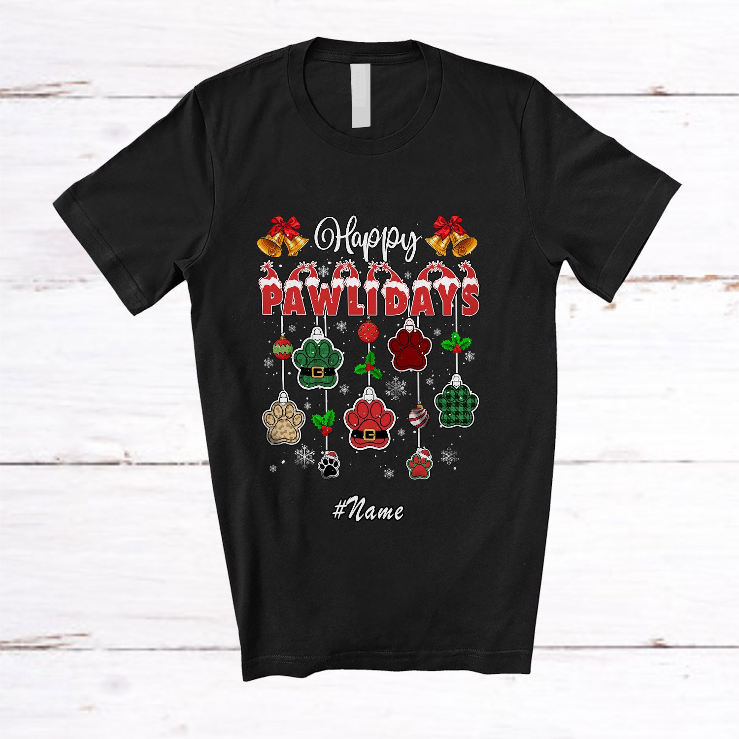 • Personalized Custom Name Happy Pawlidays; Lovely Christmas Ornaments Plaid Dog Paws Owner T-Shirt. This cotton t-shirt is a durable staple product with a classic fit. One of the most popular items, it has a relaxed style made for everyday and casual wear.