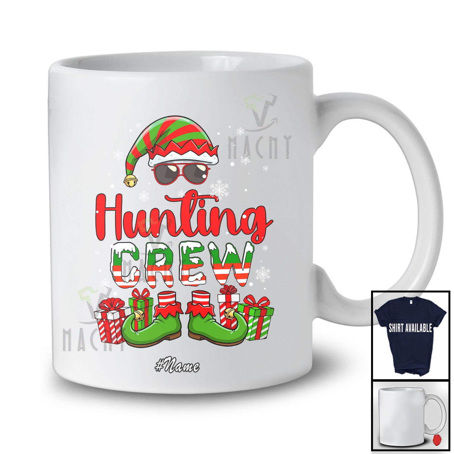 Personalized Custom Name Hunting Crew; Lovely Christmas Elf Sunglasses; Pajama Family Group T-Shirt. This cotton t-shirt is a durable staple product with a classic fit. One of the most popular items, it has a relaxed style made for everyday and casual wear.