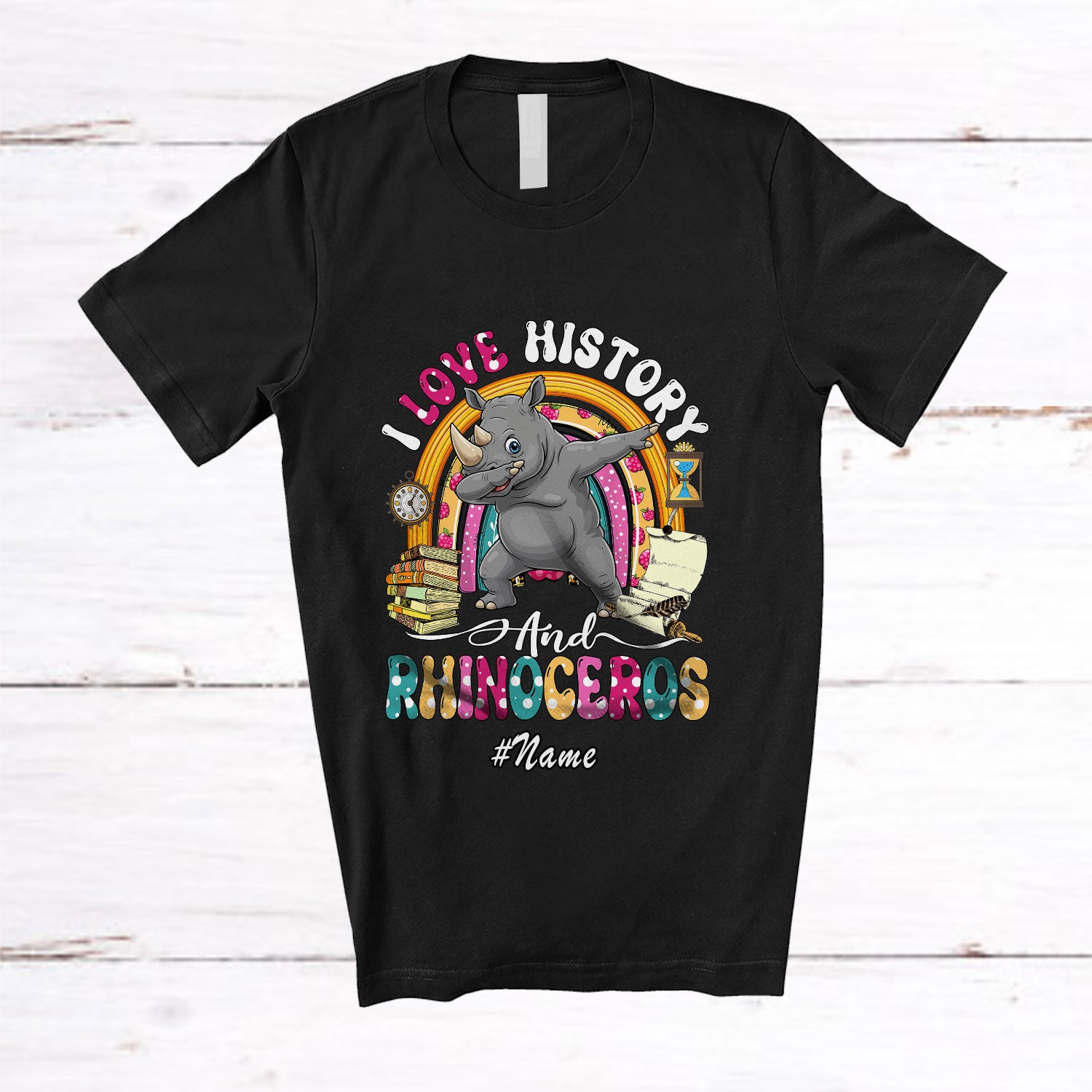 Personalized Custom Name I Love History And Rhinoceros; Joyful Dabbing Rainbow; Teacher Students T-Shirt. This cotton t-shirt is a durable staple product with a classic fit. One of the most popular items, it has a relaxed style made for everyday and casual wear.