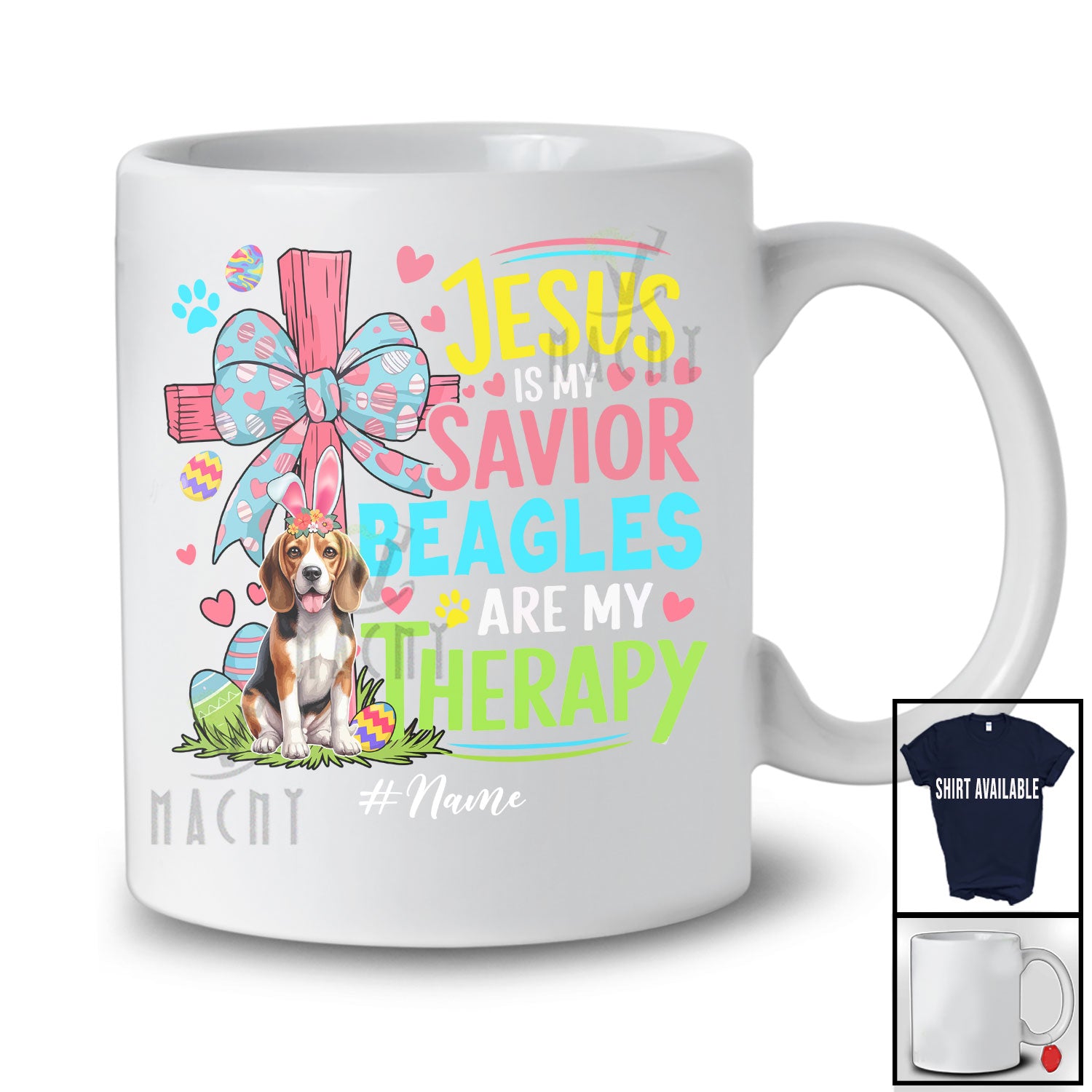 Personalized Custom Name Jesus Is My Savior Beagles Are My Therapy; Happy Easter Cross Eggs T-Shirt. This cotton t-shirt is a durable staple product with a classic fit. One of the most popular items, it has a relaxed style made for everyday and casual wear.
