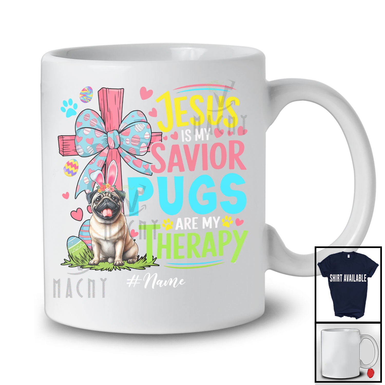 Personalized Custom Name Jesus Is My Savior Pugs Are My Therapy; Happy Easter Cross Eggs T-Shirt. This cotton t-shirt is a durable staple product with a classic fit. One of the most popular items, it has a relaxed style made for everyday and casual wear.