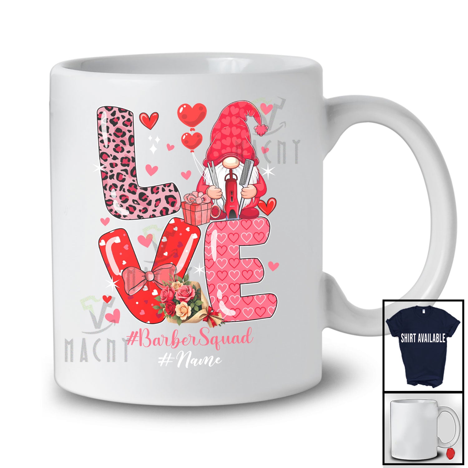 Personalized Custom Name Love Barber Squad; Lovely Valentine Hearts Gnome Leopard T-Shirt
