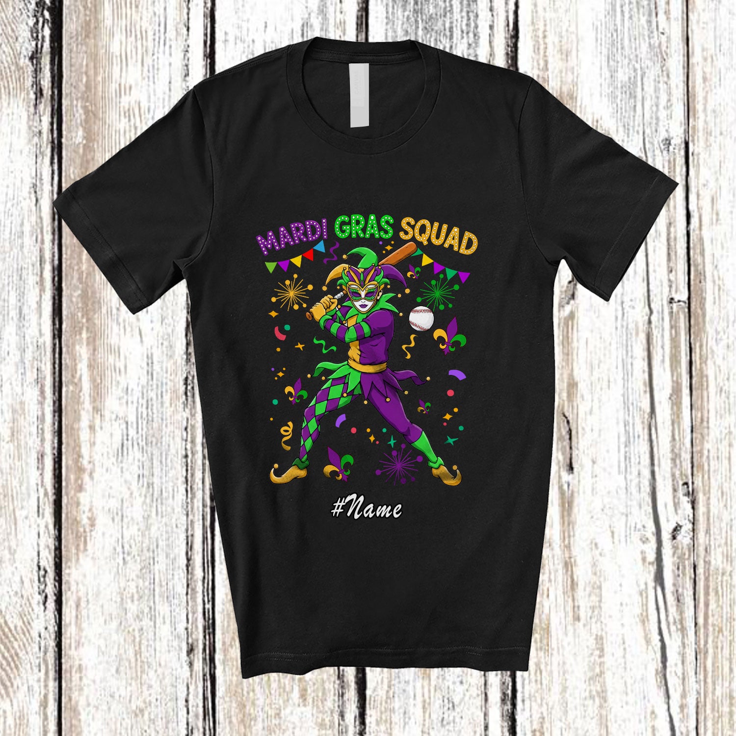 Personalized Custom Name Mardi Gras Squad; Amusing Mardi Gras Baseball Playing Player Sport T-Shirt