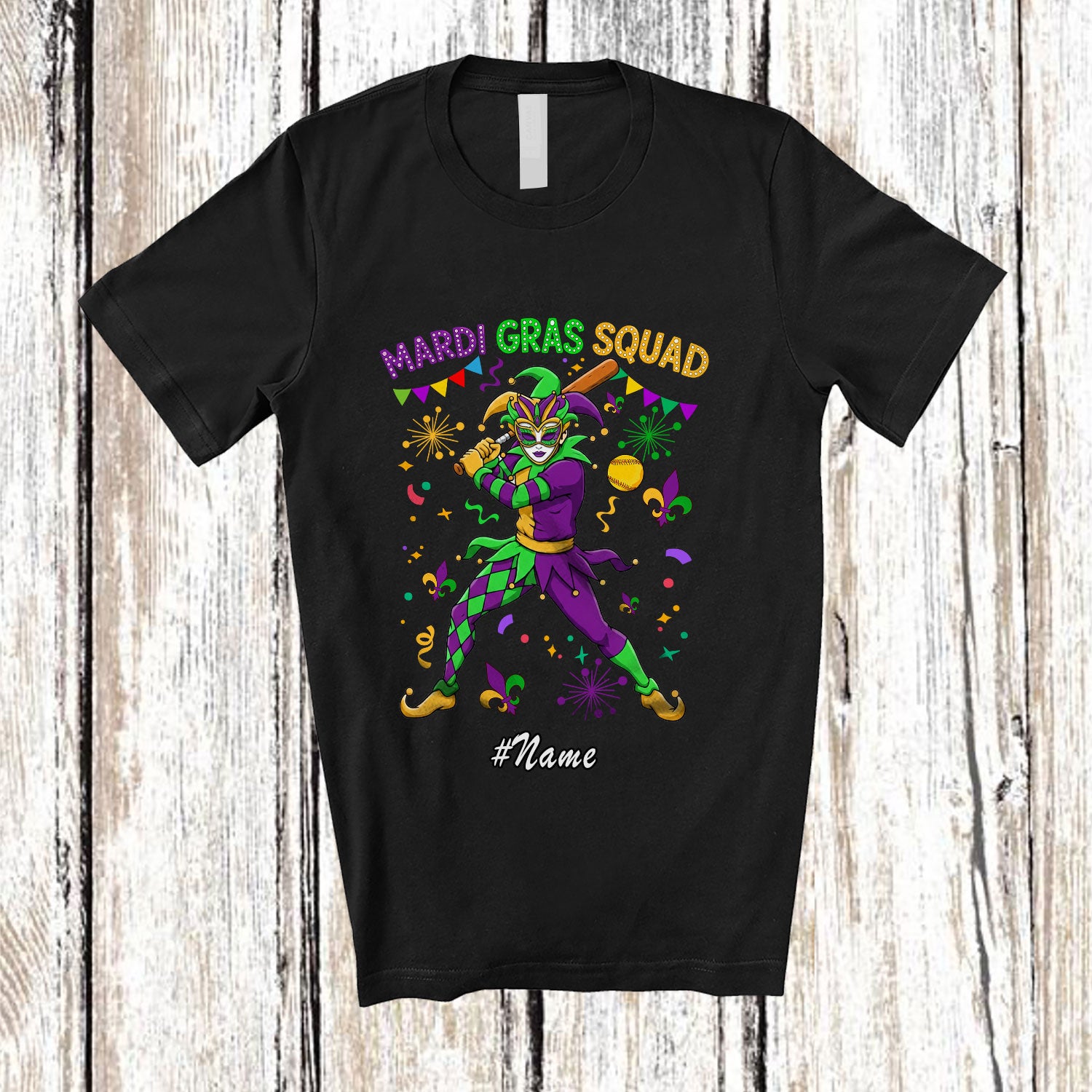 • Personalized Custom Name Mardi Gras Squad; Amusing Mardi Gras Softball Playing Player Sport T-Shirt. This cotton t-shirt is a durable staple product with a classic fit. One of the most popular items, it has a relaxed style made for everyday and casual wear.