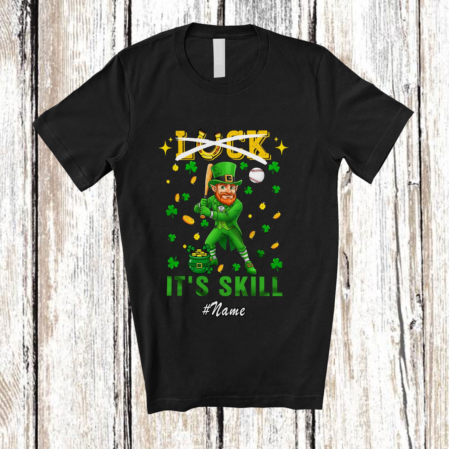 Personalized Custom Name Not Luck It's Skill; Amusing St. Patrick's Day Baseball Playing Player T-Shirt. This cotton t-shirt is a durable staple product with a classic fit. One of the most popular items, it has a relaxed style made for everyday and casual wear.