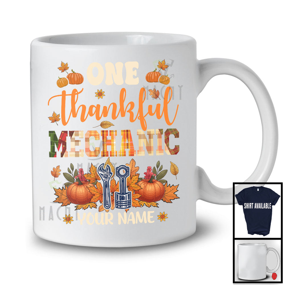 Personalized Custom Name One Thankful Mechanic; Happy Thanksgiving Plaid Pumpkins; Jobs T-Shirt. This cotton t-shirt is a durable staple product with a classic fit. One of the most popular items, it has a relaxed style made for everyday and casual wear.