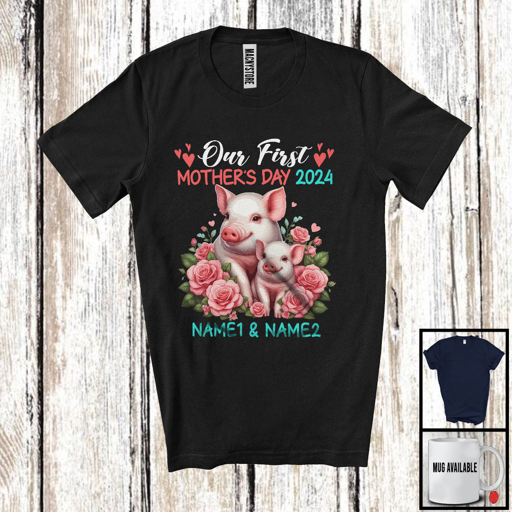Personalized Custom Name Our First Mother's Day 2024, Adorable Pig Farmer, Family Group T-Shirt