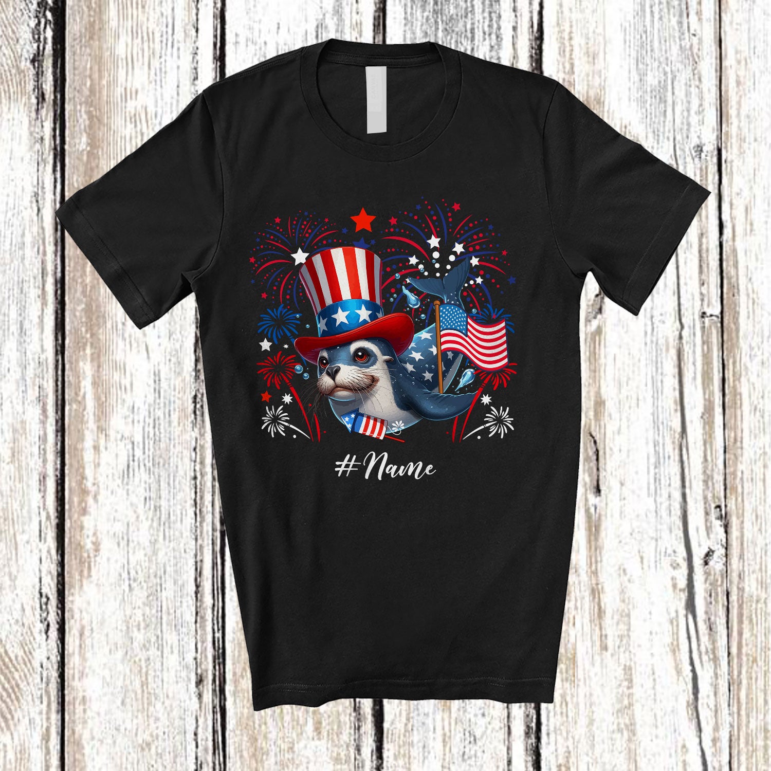 Personalized Custom Name Patriotic Sea Lion With US Flag; Lovely 4th Of July Sea Lion Sea Animal T-Shirt