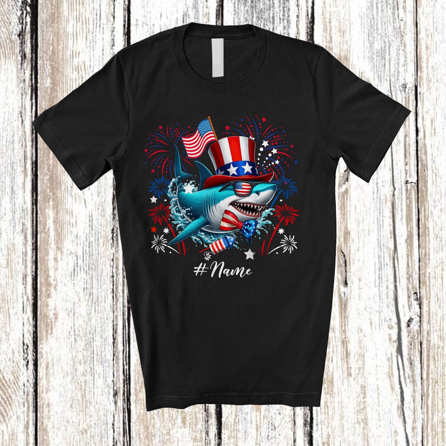 Personalized Custom Name Patriotic Shark With US Flag; Lovely 4th Of July Shark Sea Animal T-Shirt. This cotton t-shirt is a durable staple product with a classic fit. One of the most popular items, it has a relaxed style made for everyday and casual wear.