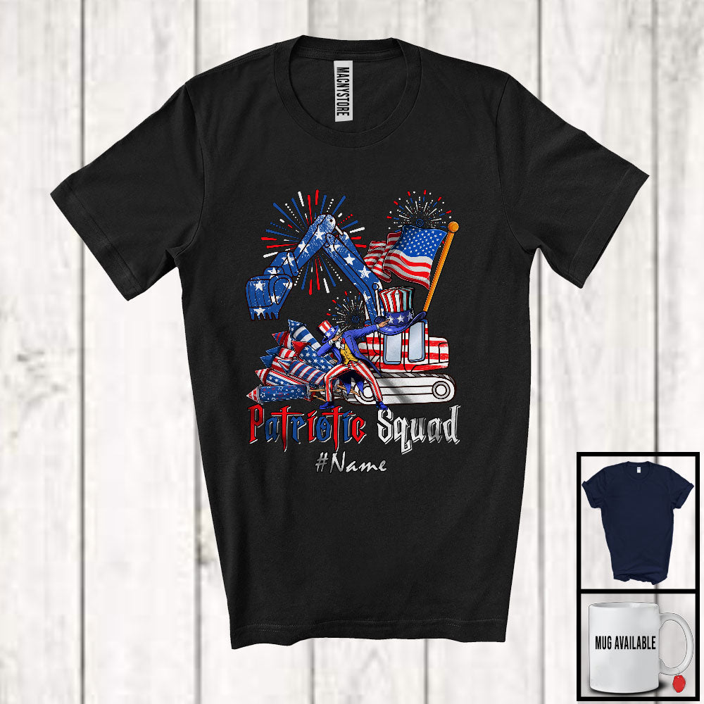 • Personalized Custom Name Patriotic Squad, Proud 4th Of July Excavator Construction, Firecrackers T-Shirt. This cotton t-shirt is a durable staple product with a classic fit. One of the most popular items, it has a relaxed style made for everyday and casual wear.