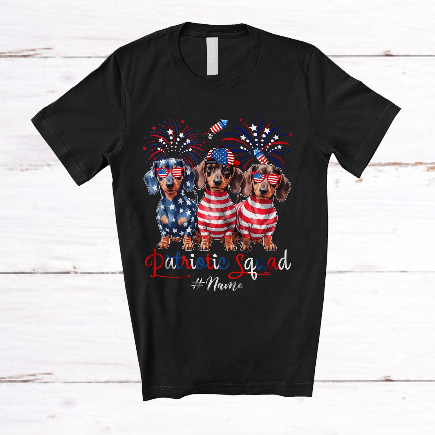 Personalized Custom Name Patriotic Squad; Proud 4th Of July US Flag Three Dachshund Owner T-Shirt. This cotton t-shirt is a durable staple product with a classic fit. One of the most popular items, it has a relaxed style made for everyday and casual wear.
