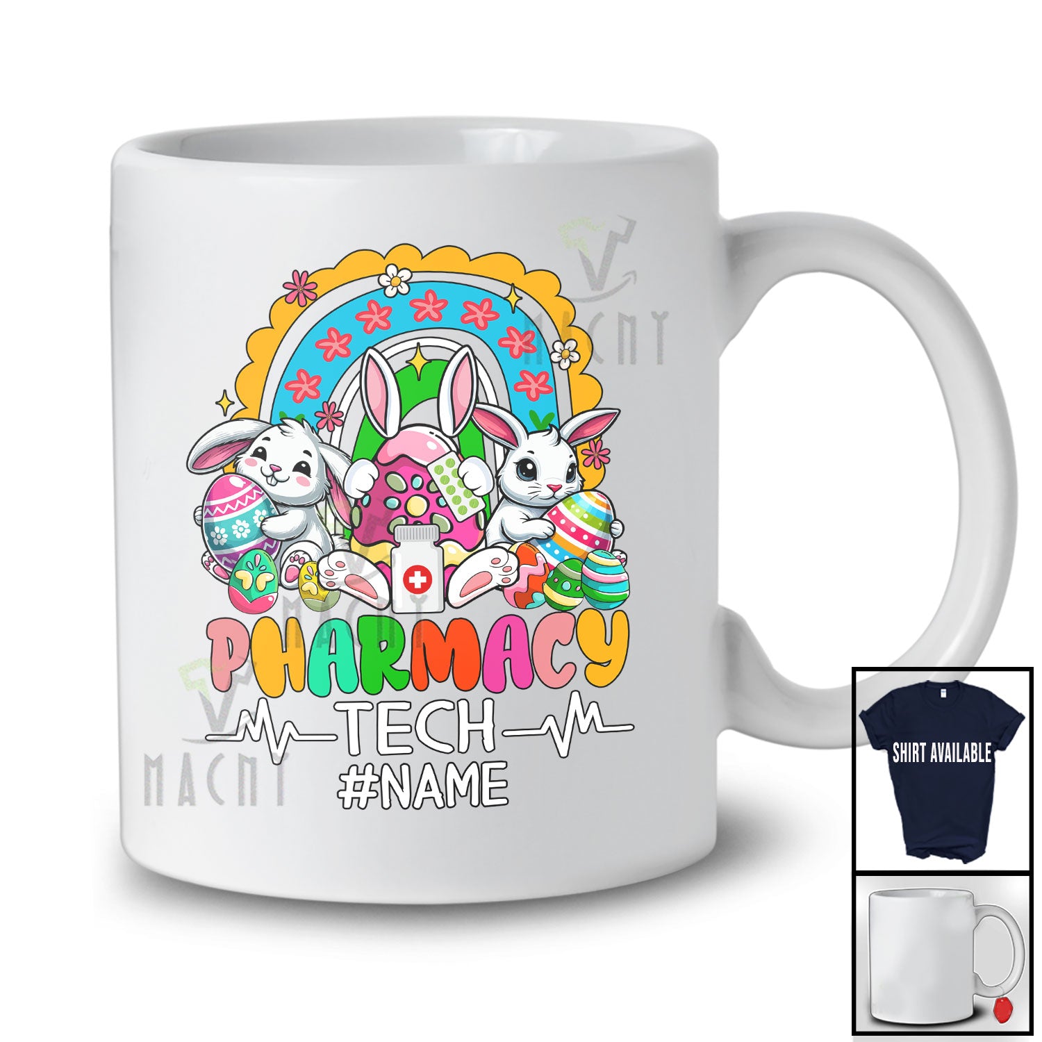 The Personalized Custom Name Pharmacy Tech; Adorable Easter Bunnies Hunting Eggs; Rainbow Family T-Shirt destined to impress, and priced at only $12.95, for a limited time.