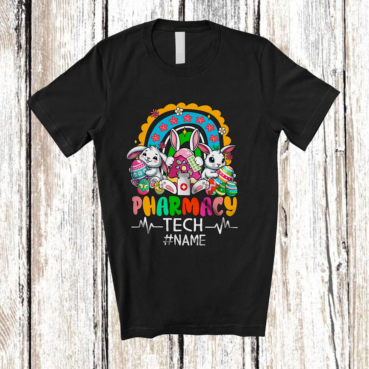Personalized Custom Name Pharmacy Tech; Adorable Easter Bunnies Hunting Eggs; Rainbow Family T-Shirt. This cotton t-shirt is a durable staple product with a classic fit. One of the most popular items, it has a relaxed style made for everyday and casual wear.