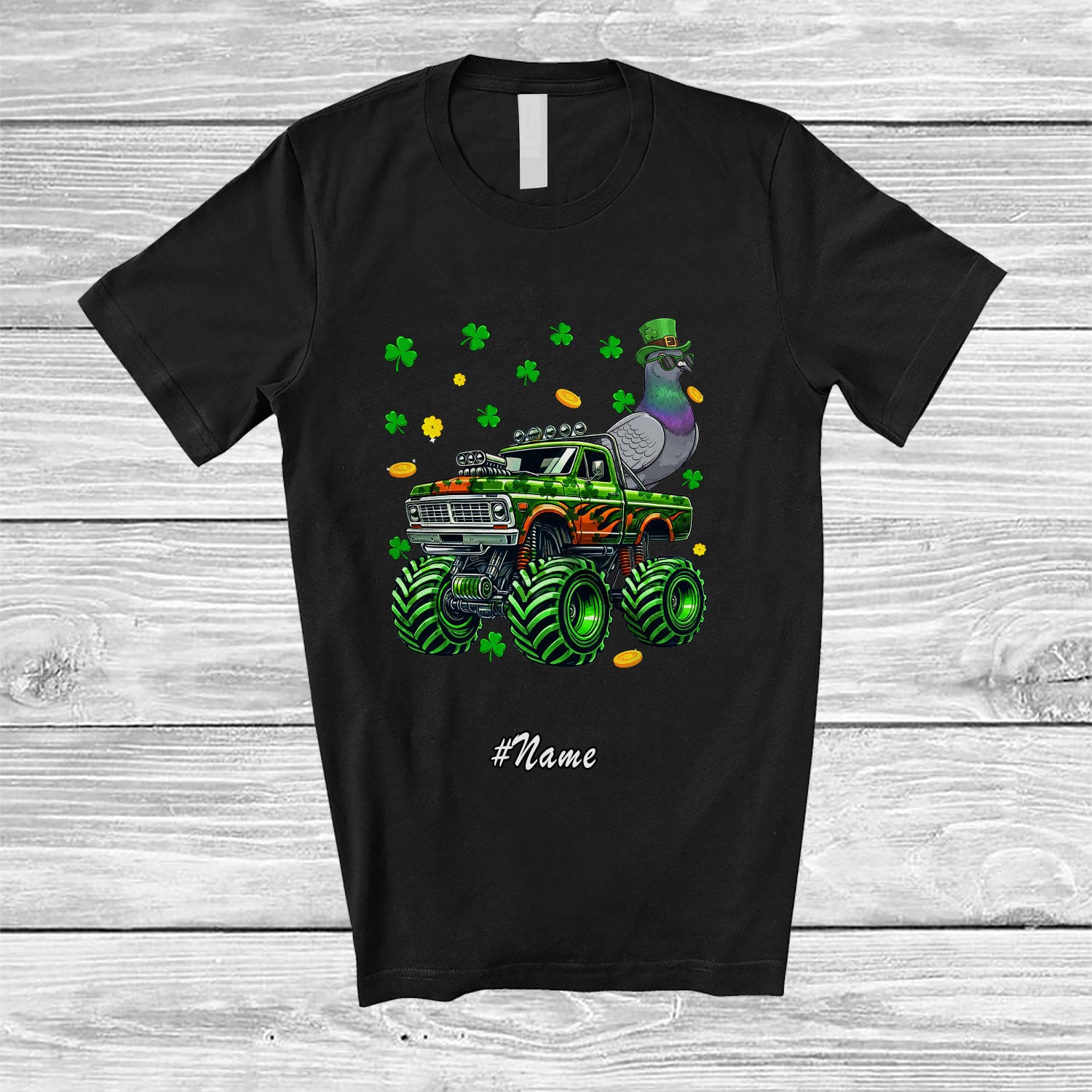 Personalized Custom Name Pigeon On Monster Truck; Joyful St. Patrick's Day Shamrock Bird T-Shirt. This cotton t-shirt is a durable staple product with a classic fit. One of the most popular items, it has a relaxed style made for everyday and casual wear.