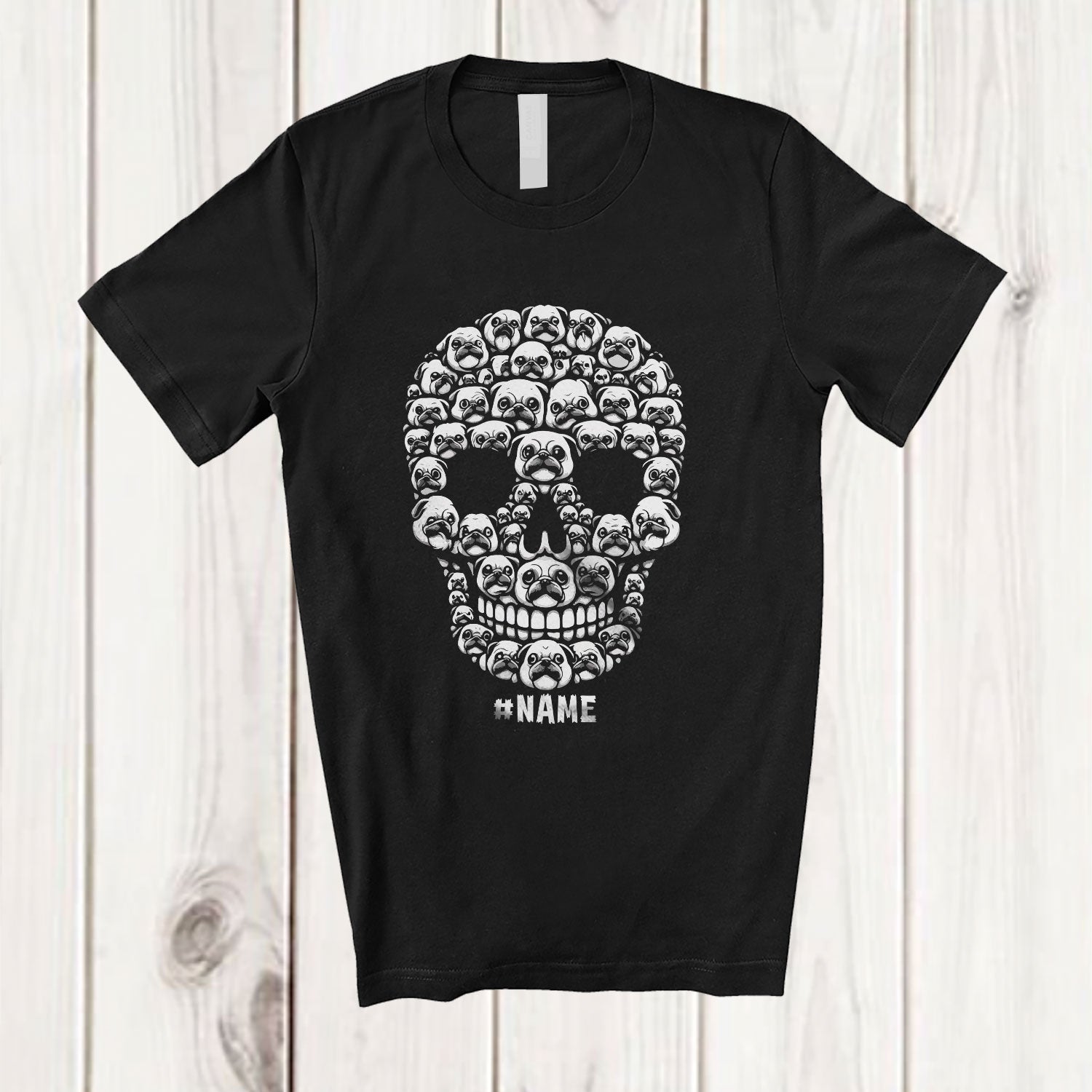 Personalized Custom Name Skull Shape Pug Owner; Scary Halloween Animal Family T-Shirt. This cotton t-shirt is a durable staple product with a classic fit. One of the most popular items, it has a relaxed style made for everyday and casual wear.
