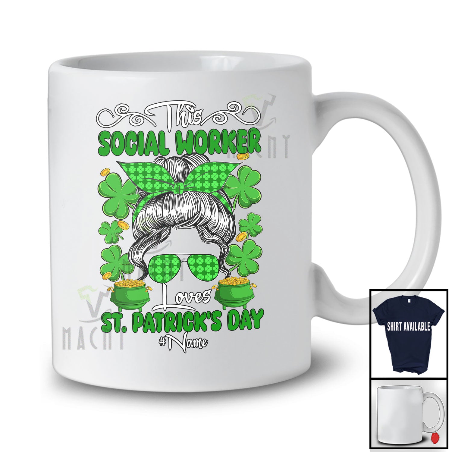 Personalized Custom Name This Social Worker Loves St. Patrick's Day; Proud Plaid Messy Bun Hair T-Shirt. This cotton t-shirt is a durable staple product with a classic fit. One of the most popular items, it has a relaxed style made for everyday and casual wear.