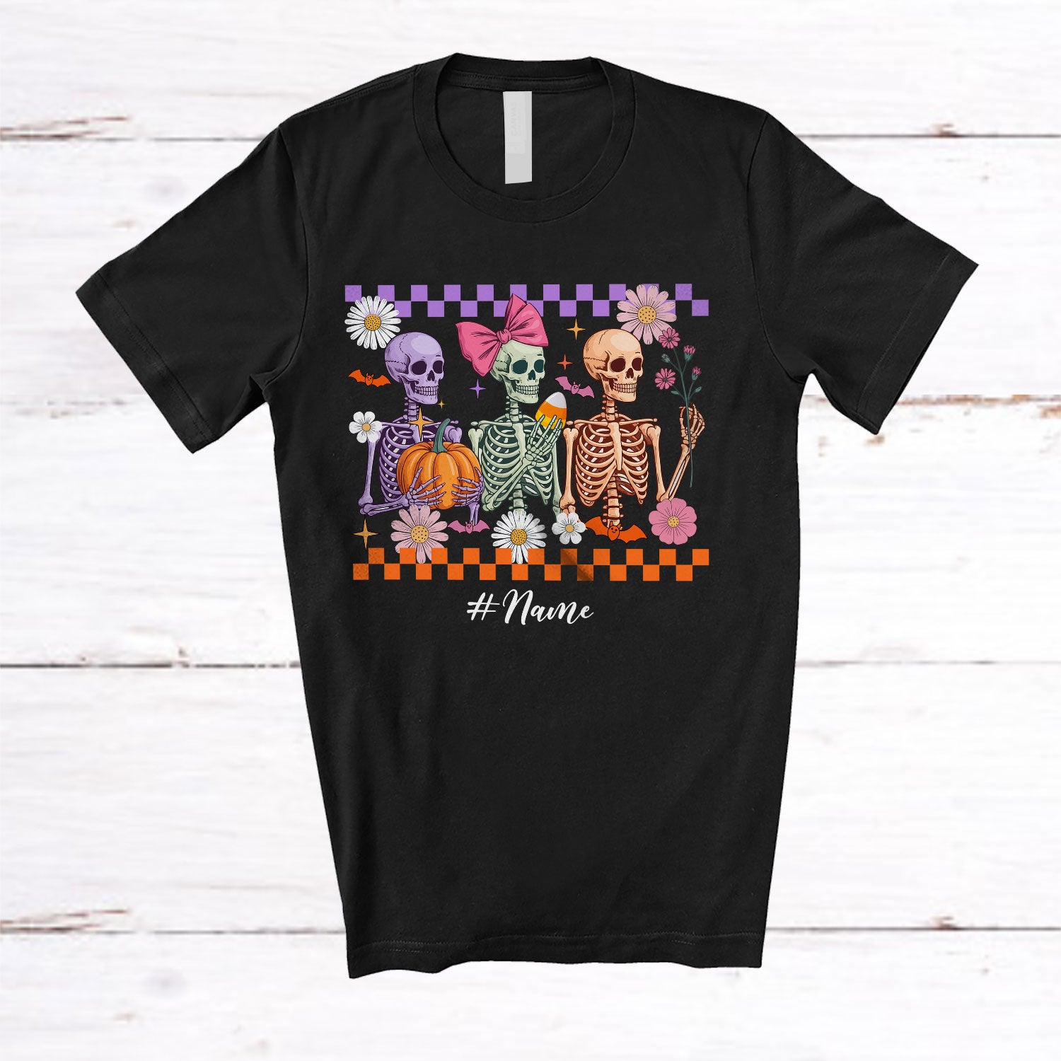 Personalized Custom Name Three Colorful Skeleton; Lovely Halloween Groovy Bow Tie; Flowers T-Shirt