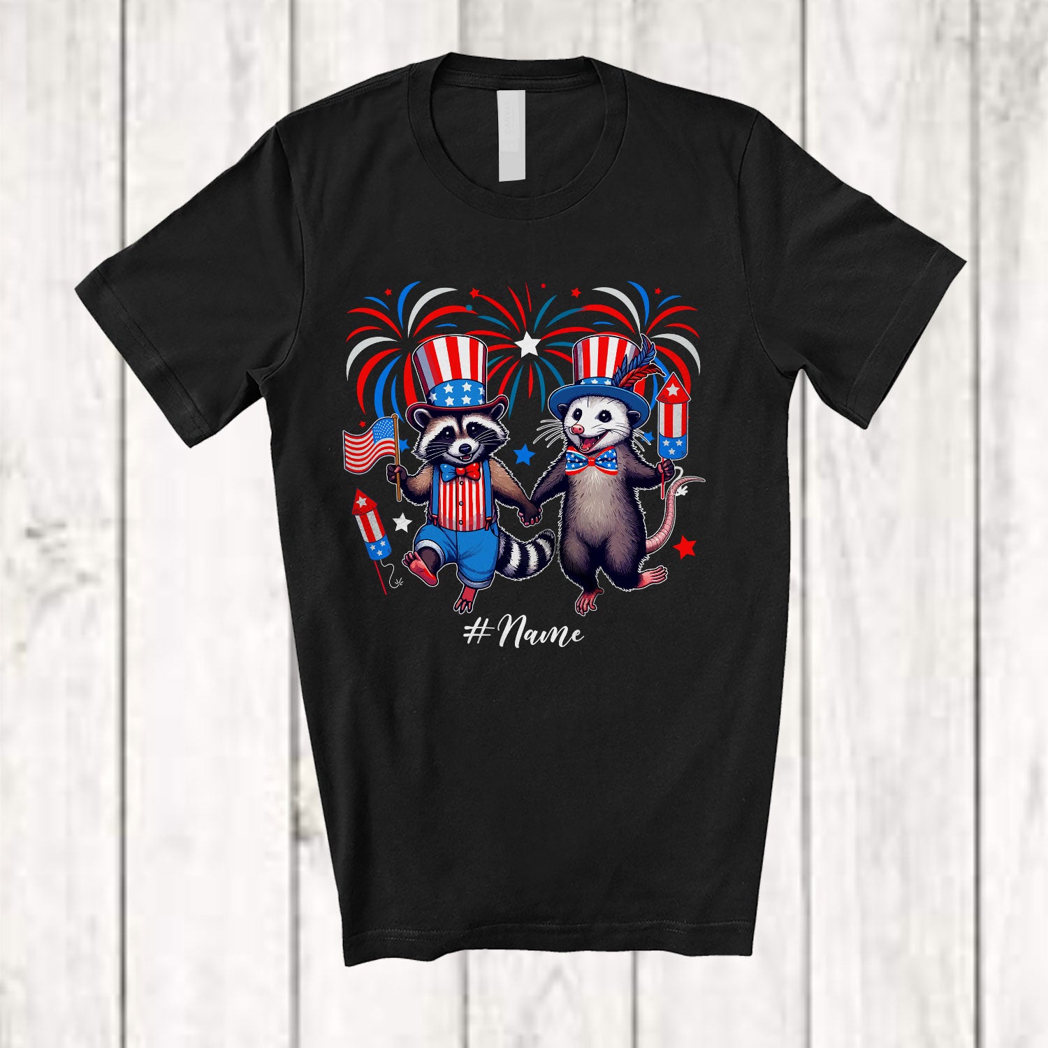 Personalized Custom Name US Flag Fireworks Raccoon and Opossum; Joyful 4th of July Patriotic T-Shirt