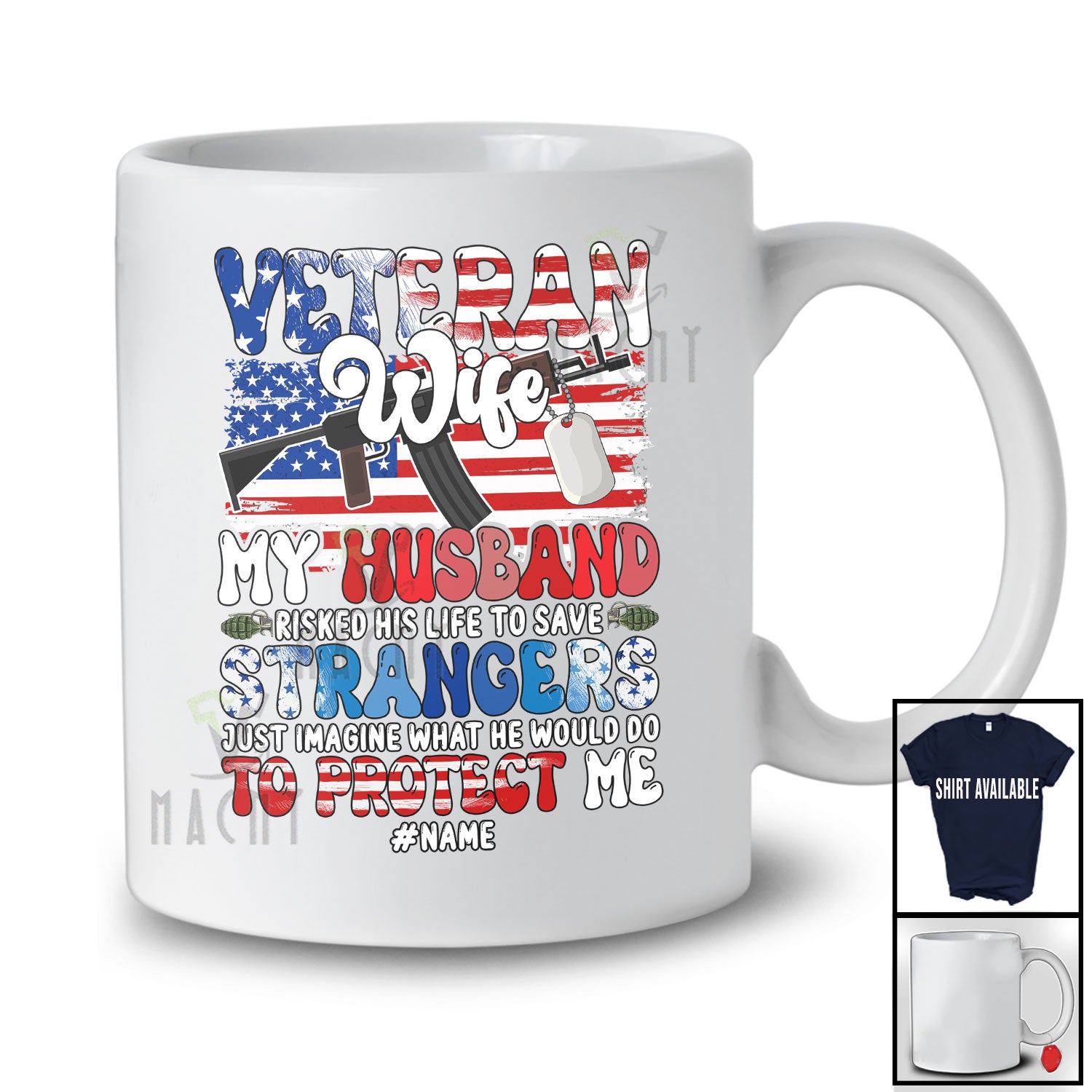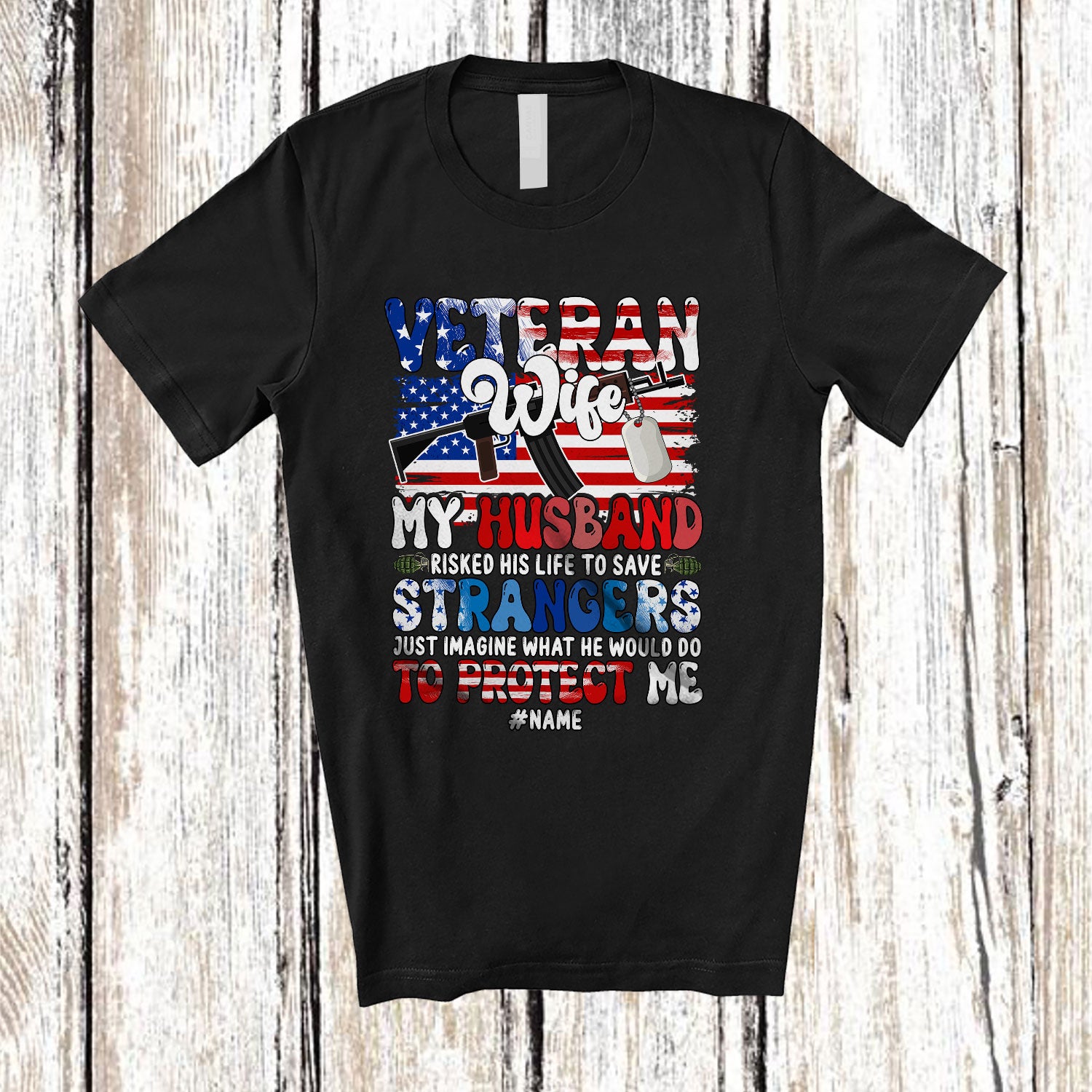 • Personalized Custom Name Veteran Wife My Husband; Awesome 4th Of July US Flag Family T-Shirt. This cotton t-shirt is a durable staple product with a classic fit. One of the most popular items, it has a relaxed style made for everyday and casual wear.