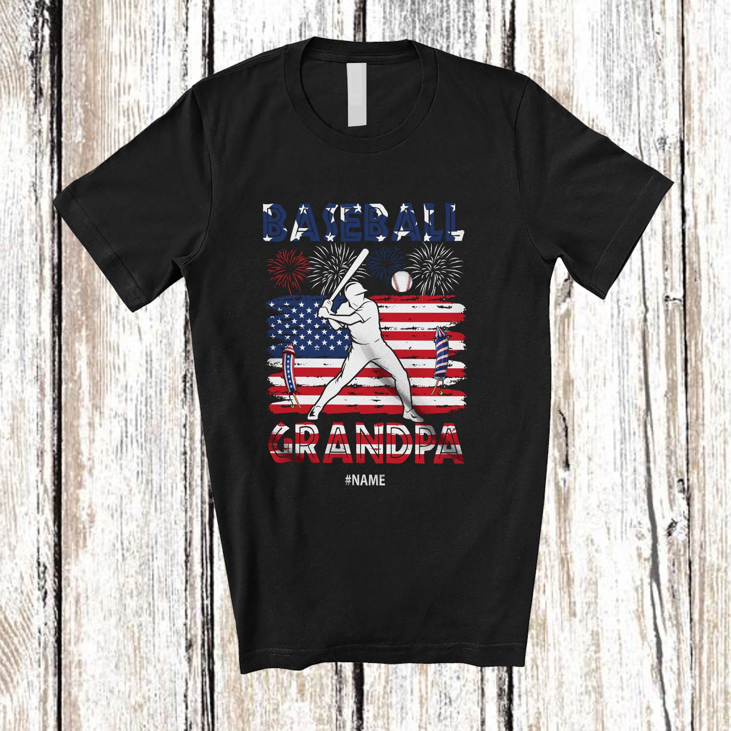 Personalized Custom Name Vintage US Flag Baseball Grandpa; Amusing 4th Of July Player Family T-Shirt. This cotton t-shirt is a durable staple product with a classic fit. One of the most popular items, it has a relaxed style made for everyday and casual wear.