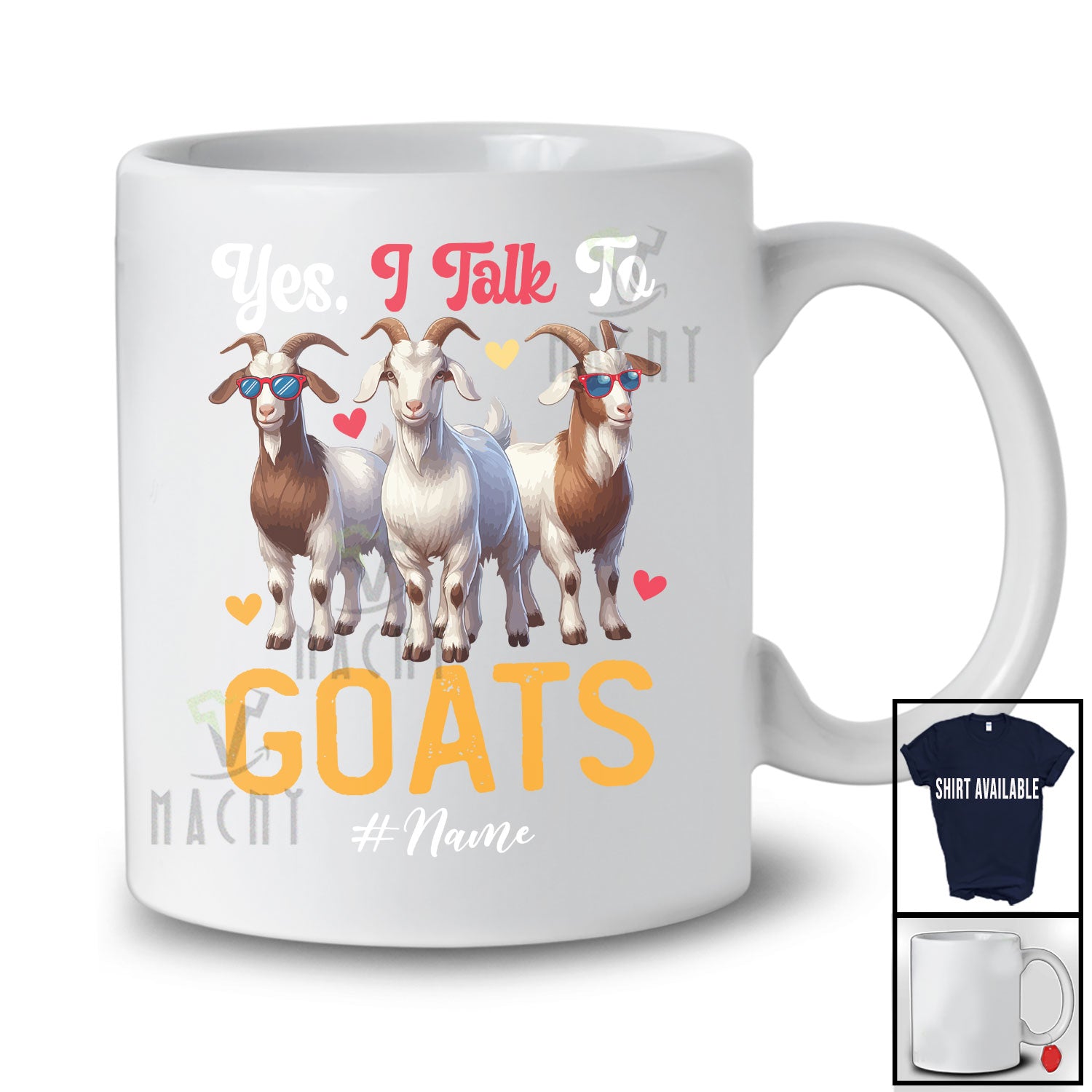 • Personalized Custom Name Yes; I Talk To Goats; Humorous Three Sunglasses Goats Farmer T-Shirt. This cotton t-shirt is a durable staple product with a classic fit. One of the most popular items, it has a relaxed style made for everyday and casual wear.
