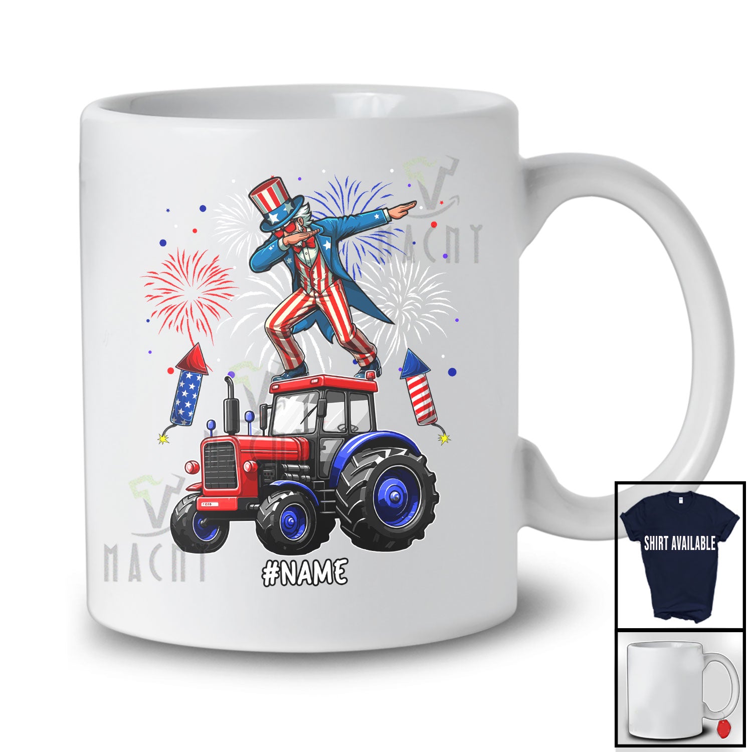Personalized Dabbing Uncle Sam On Tractor; Cheerful 4th Of July Custom Name Patriotic T-Shirt. This cotton t-shirt is a durable staple product with a classic fit. One of the most popular items, it has a relaxed style made for everyday and casual wear.