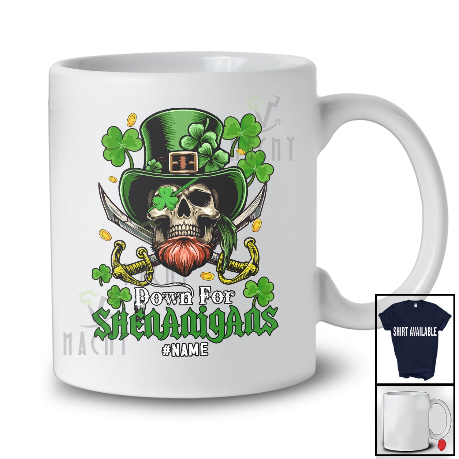Personalized Down For Shenanigans; Scary St. Patrick's Day Custom Name Skull Pirate Leprechaun T-Shirt. This cotton t-shirt is a durable staple product with a classic fit. One of the most popular items, it has a relaxed style made for everyday and casual wear.