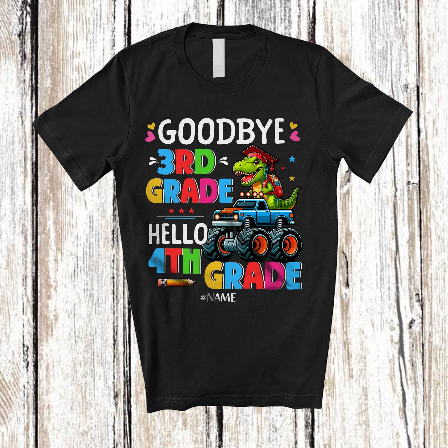 Personalized Goodbye 3rd Grade Hello 4th Grade; Joyful Graduate Custom Name T-Rex Monster Truck T-Shirt. This cotton t-shirt is a durable staple product with a classic fit. One of the most popular items, it has a relaxed style made for everyday and casual wear.