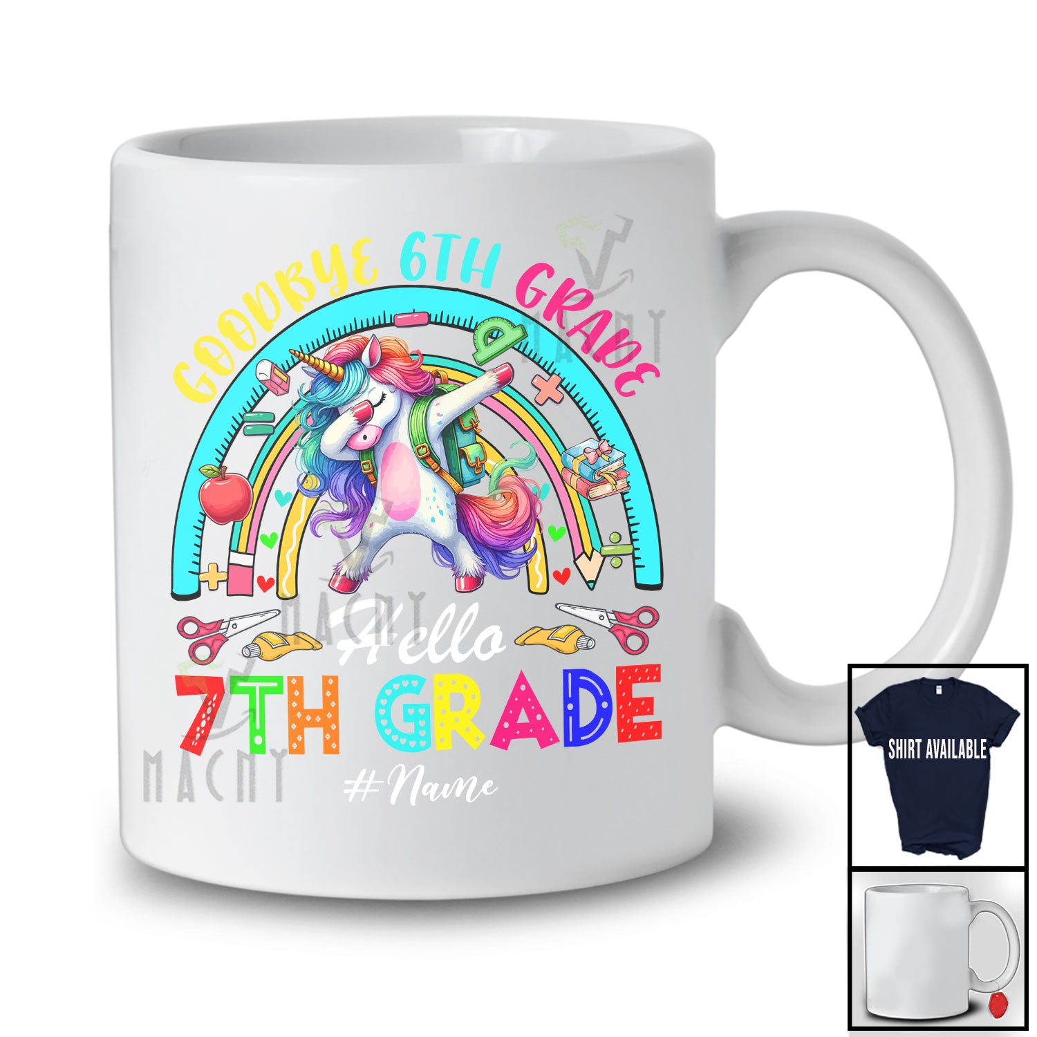 • Personalized Goodbye 6th Hello 7th Grade; Lovely Last Day Of School Custom Name Unicorn; Rainbow T-Shirt. This cotton t-shirt is a durable staple product with a classic fit. One of the most popular items, it has a relaxed style made for everyday and casual wear.