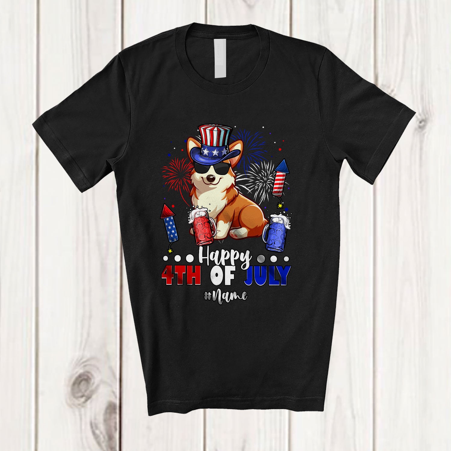 • Personalized Happy 4th Of July; Joyful Custom Name Corgi Uncle Sam Drinking Beer; Patriotic T-Shirt. This cotton t-shirt is a durable staple product with a classic fit. One of the most popular items, it has a relaxed style made for everyday and casual wear.