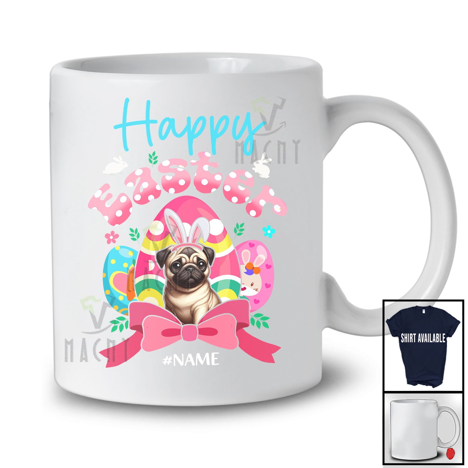 The Personalized Happy Easter; Adorable Custom Name Bunny Pug With Easter Eggs Hunt; Family T-Shirt destined to impress, and priced at only $12.95, for a limited time.